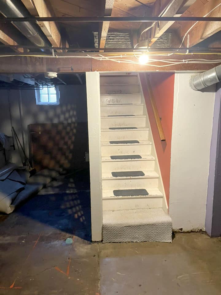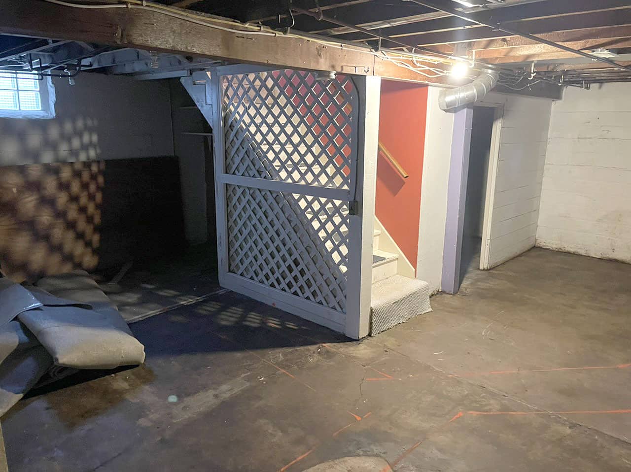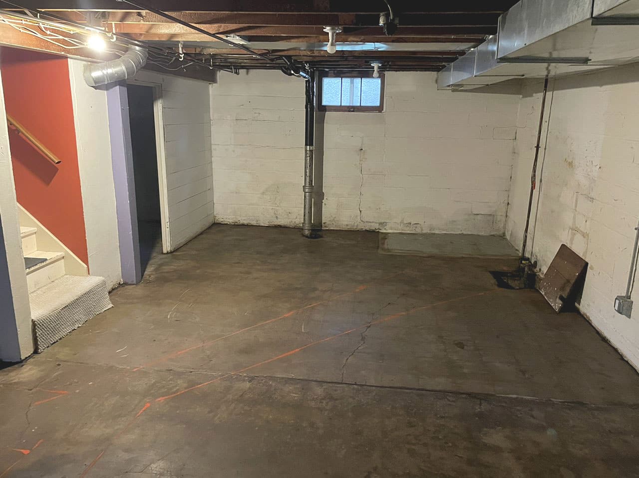 We quickly removed the lattice along the stair, threw out the old carpeting, and then started removing select areas of concrete flooring for underground plumbing and all new drain tiles. Removing areas of concrete allowed us to dig the necessary trench for new 3” plumbing lines to connect with existing city sewer lines beyond the home. Along the concrete floor, plumbers mark the new trench locations with orange spray paint as an indicator of where the concrete will need to be removed and channels dug, allowing our plumbing crew to install all new pvc piping.