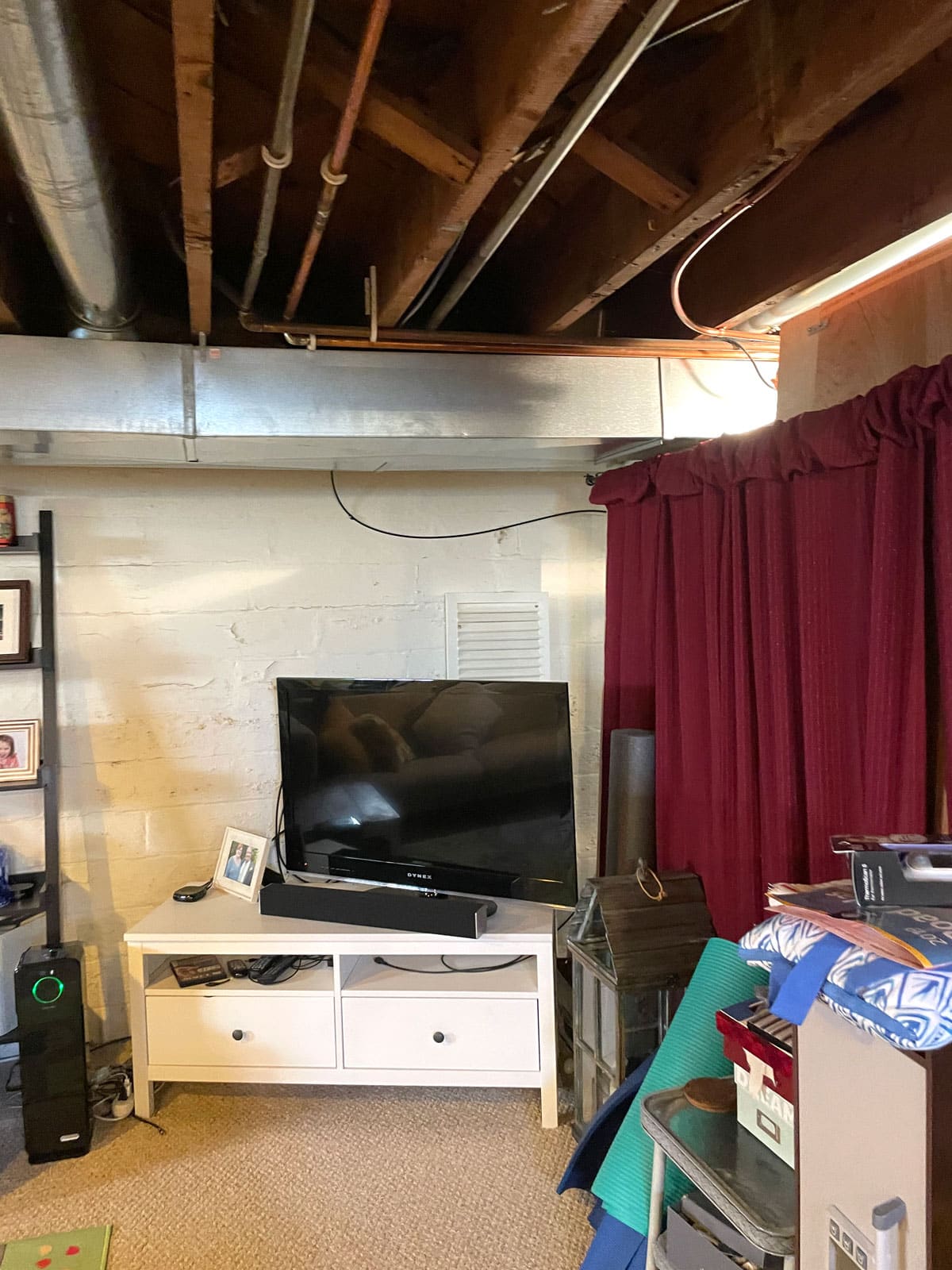 Miscellaneous plumbing and HVAC equipment seen here posed a challenge to designers looking to provide a cozy and welcoming environment for the remodeled basement.