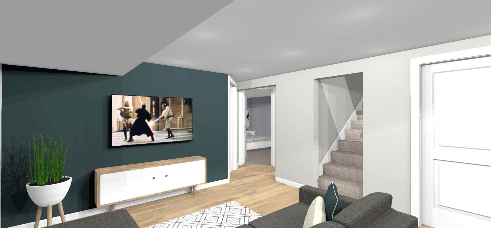 Take a sneak peek at one of our renderings for the new basement plan! We're brightening the entire basement with an open, welcoming living room just off the stairs and a private bedroom just beyond.