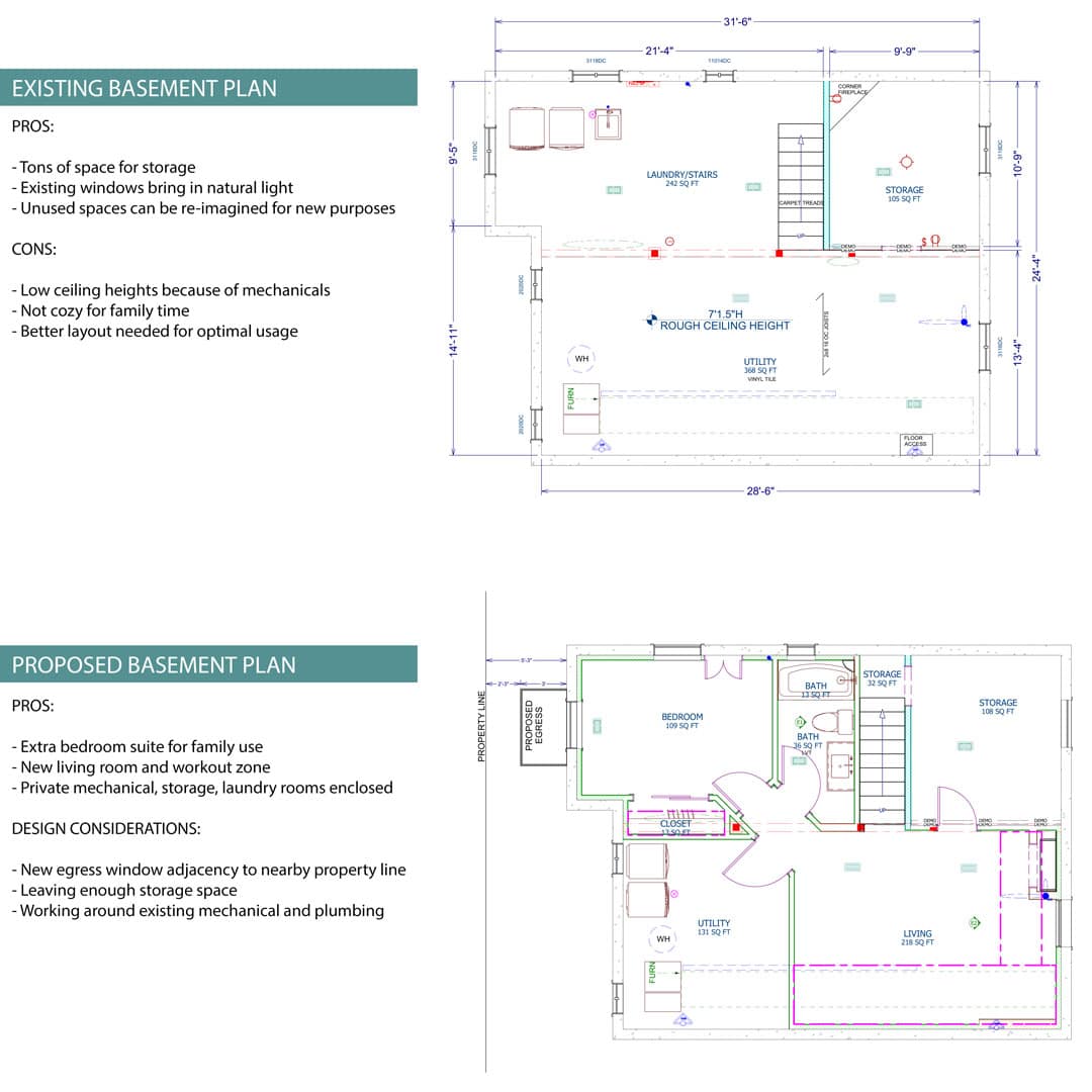 The existing basement was largely one open, unfinished space. Though the owners were able to use the space for storage, they needed much more from their home than the current configuration permitted. In the new layout proposal, the family would have generous recreational space within a family lounge and workout nook as well as enclosed storage, a laundry area, and a new bedroom suite. With some creative maneuvering, our team segmented the unfinished basement into both public and appropriately scaled private zones, like the bedroom, bath, and laundry areas. The suggested changes would give the entire family room to gather or hang out with friends.