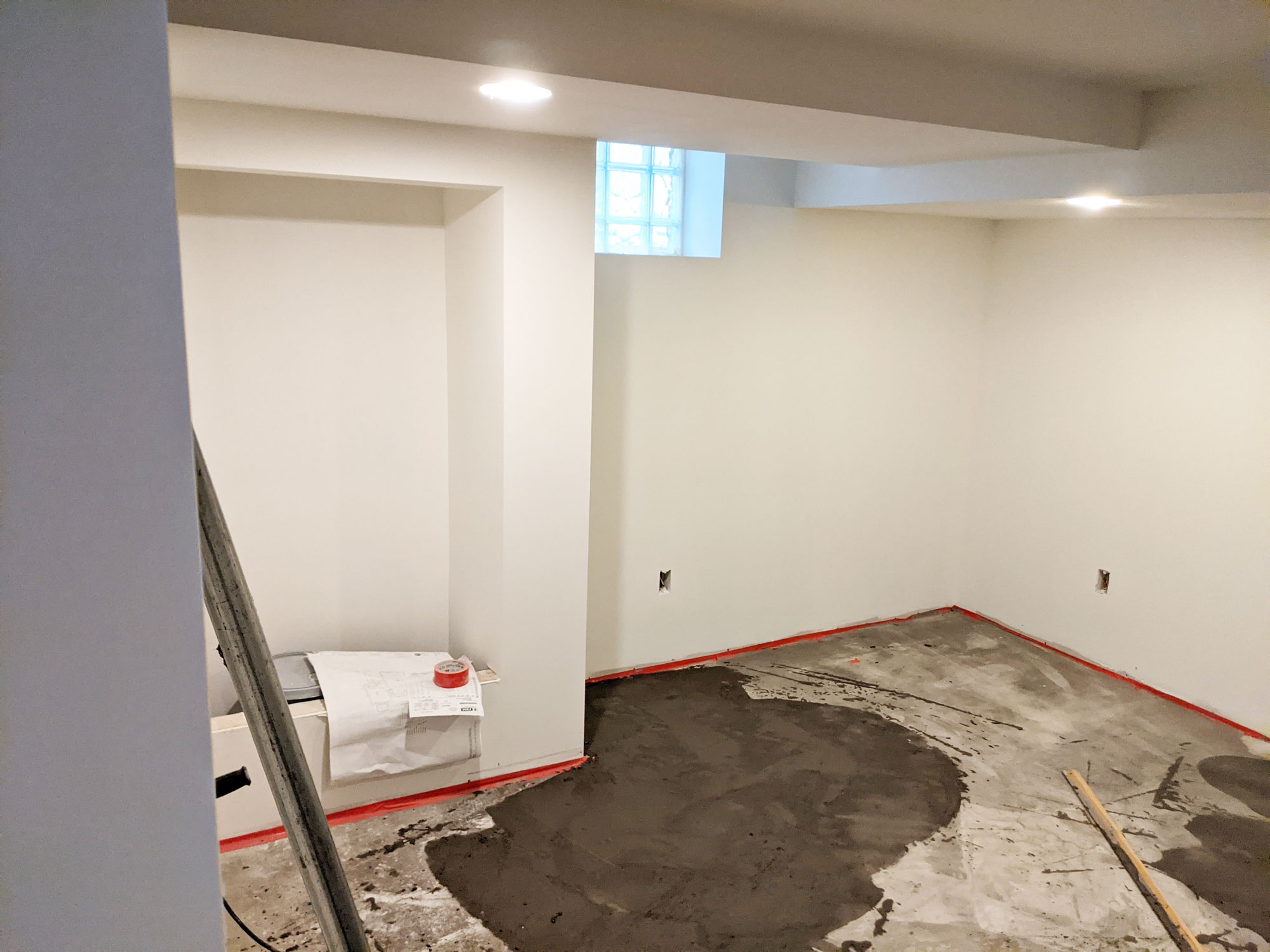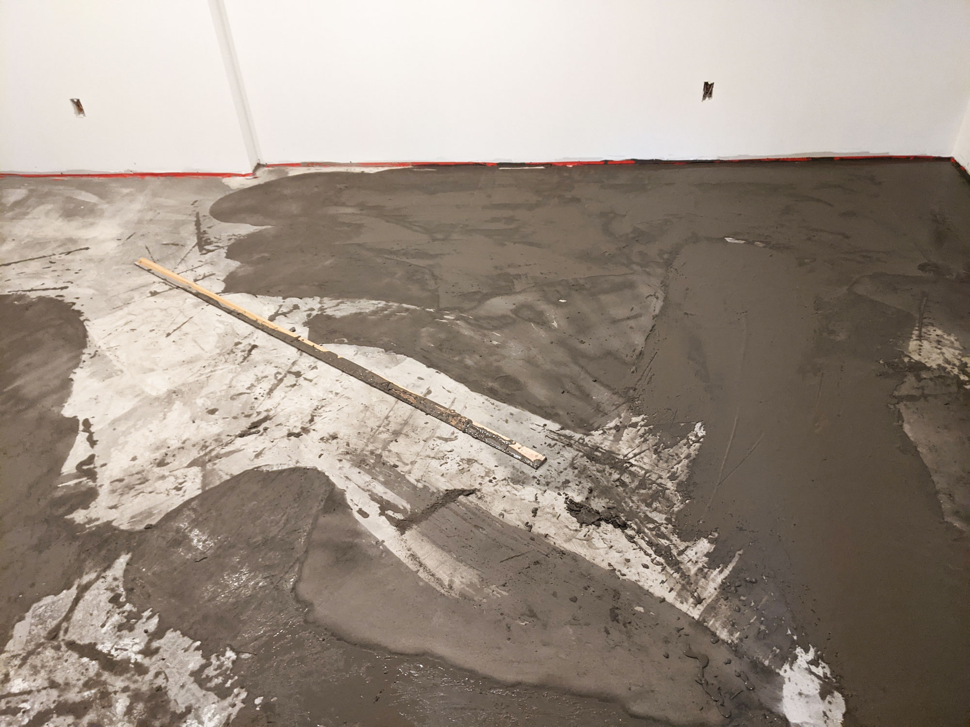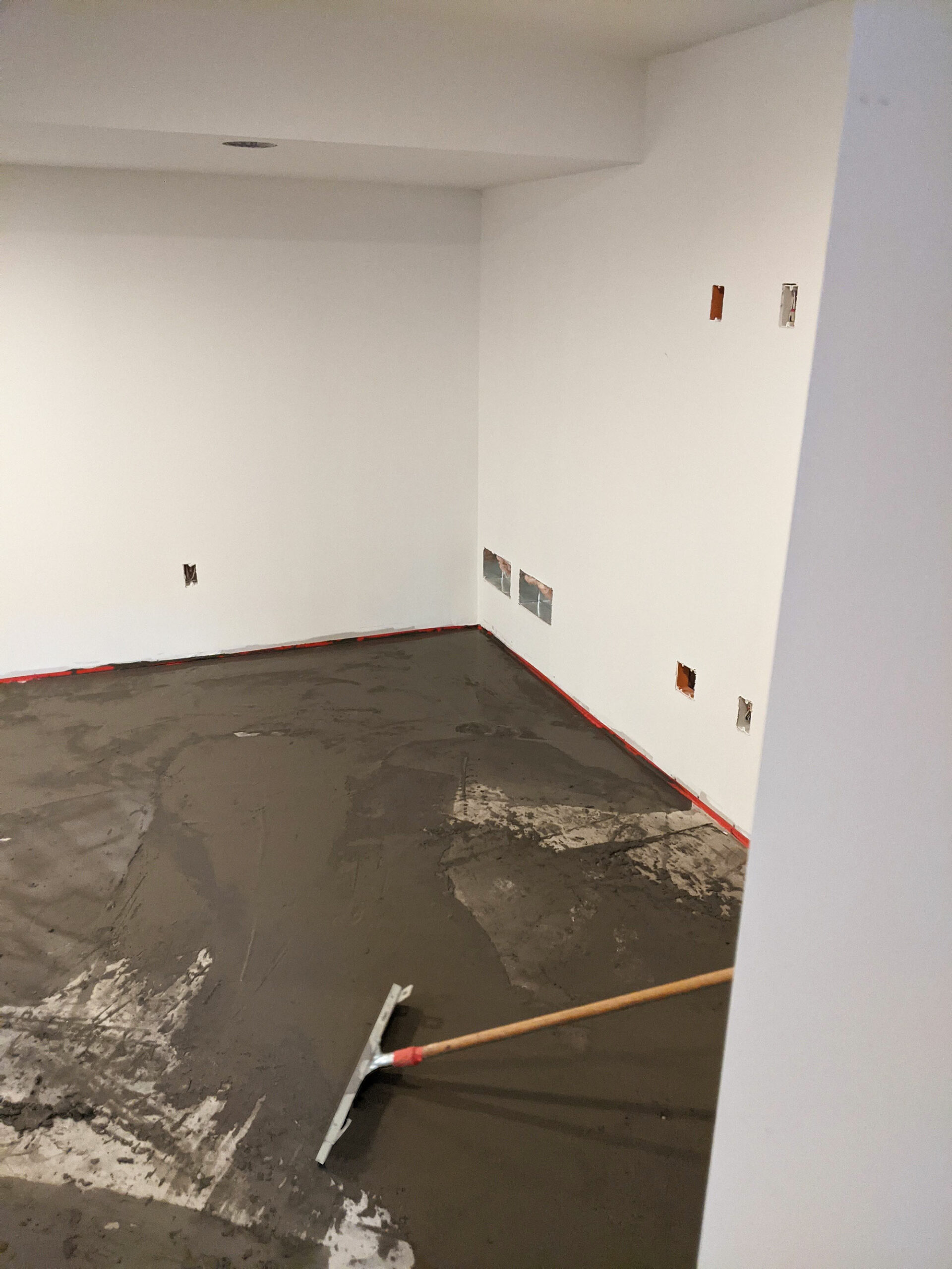 Prepping for new tile flooring means creating an even concrete surface. Pouring the first layer of self-leveler begins that process. The flooring crew uses a tool similar to a long-handled window squeegee to push the self-leveler around the basement floor. Tape is applied to the bottom of the walls around the entire basement to ensure the wet, self-leveling slurry doesn't escape confines of the floor.