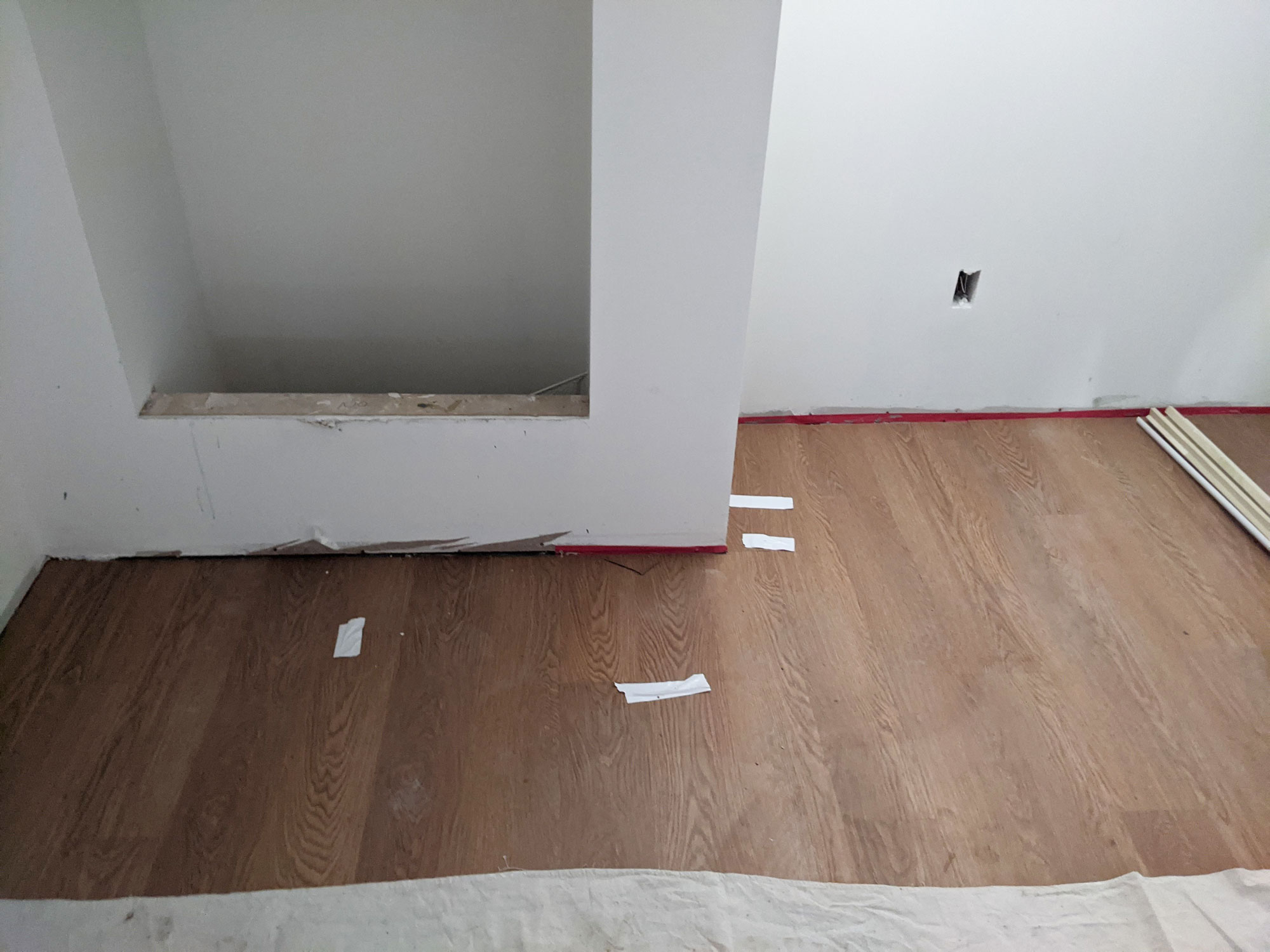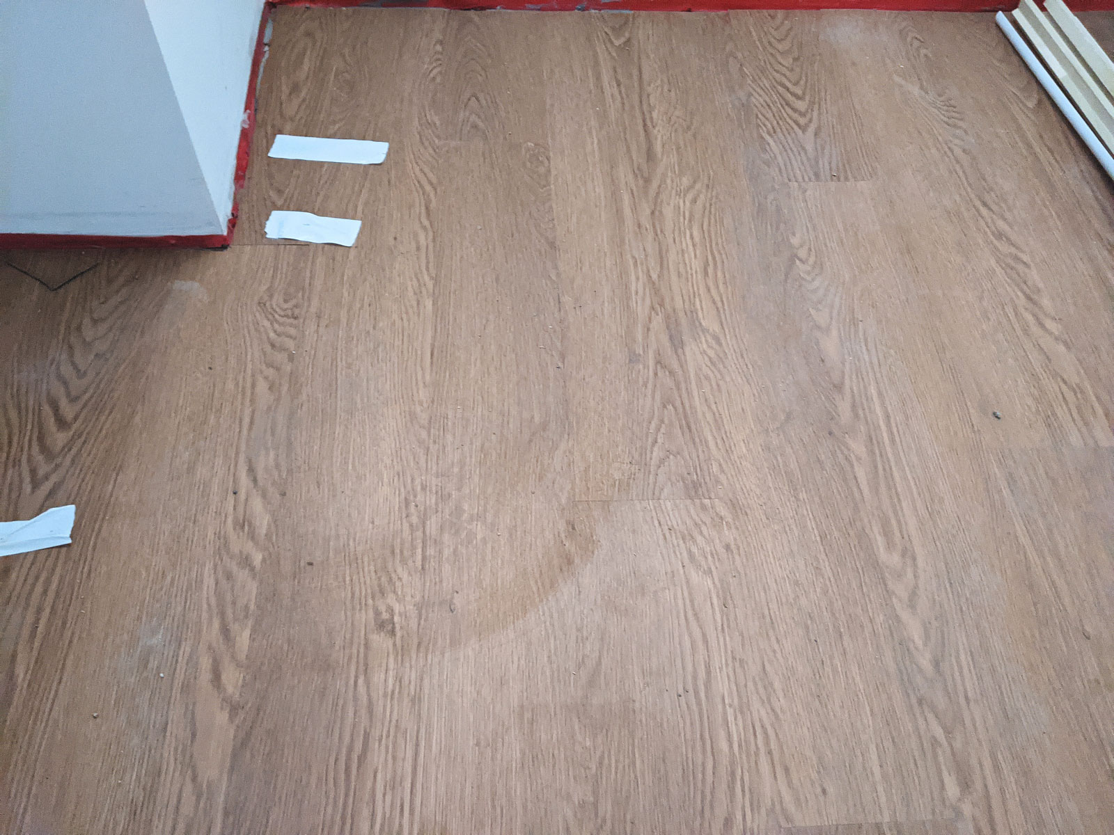 Once the appropriate glue is applied to the floor, installers started to lay out the new luxury vinyl tile called Adura Flex in Southern Oak. The covering provides a much cozier and more sophisticated atmosphere for the new basement design.
