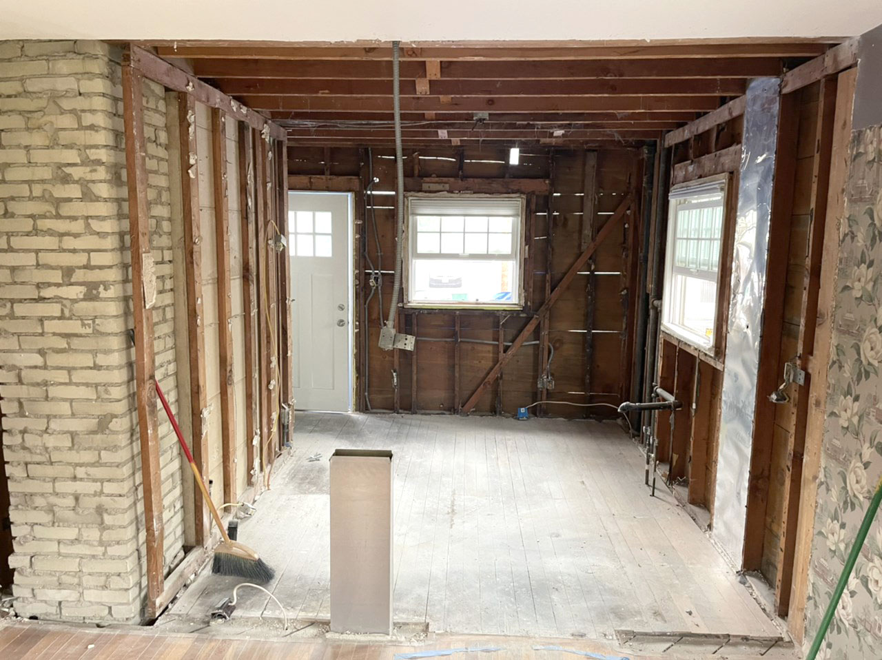 It’s time to demo the original kitchen & open the wall between the old kitchen and dining area. The kitchen/dining area is gutted to the studs, removing wall material, flooring, ceilings, cabinets, countertops, fixtures, and appliances.