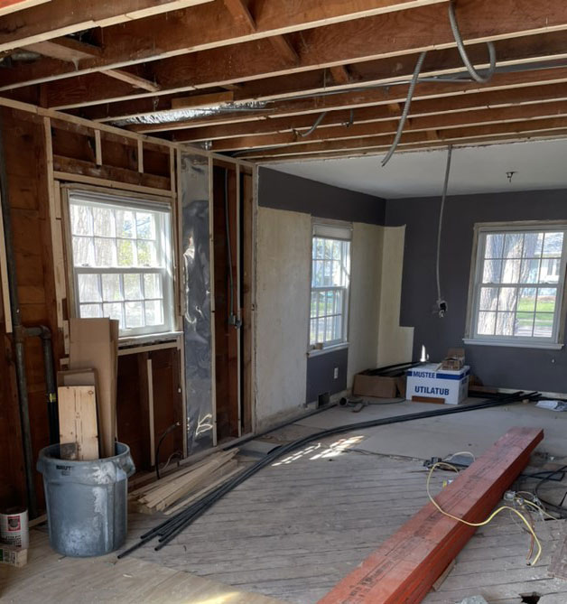 The old kitchen and dining area have been demoed, and a wall separating the spaces was removed.