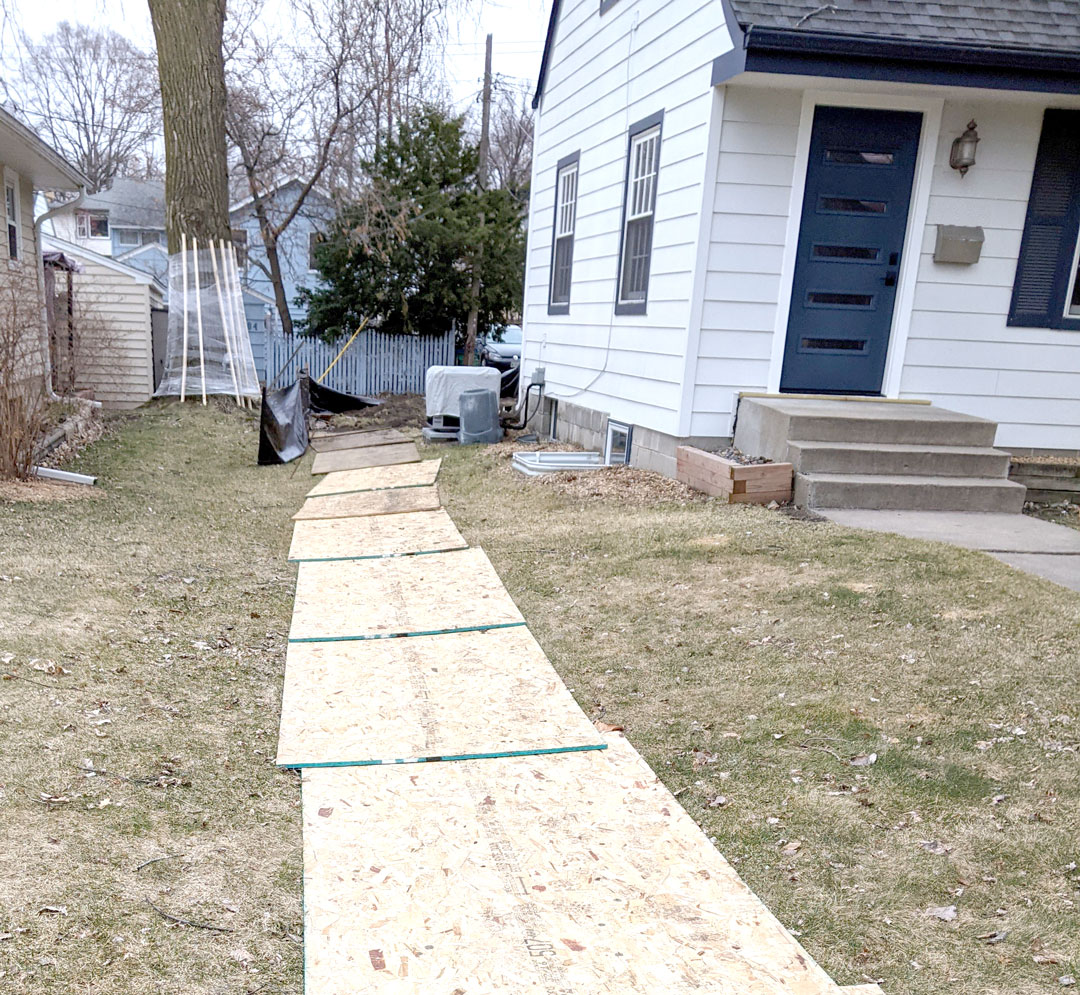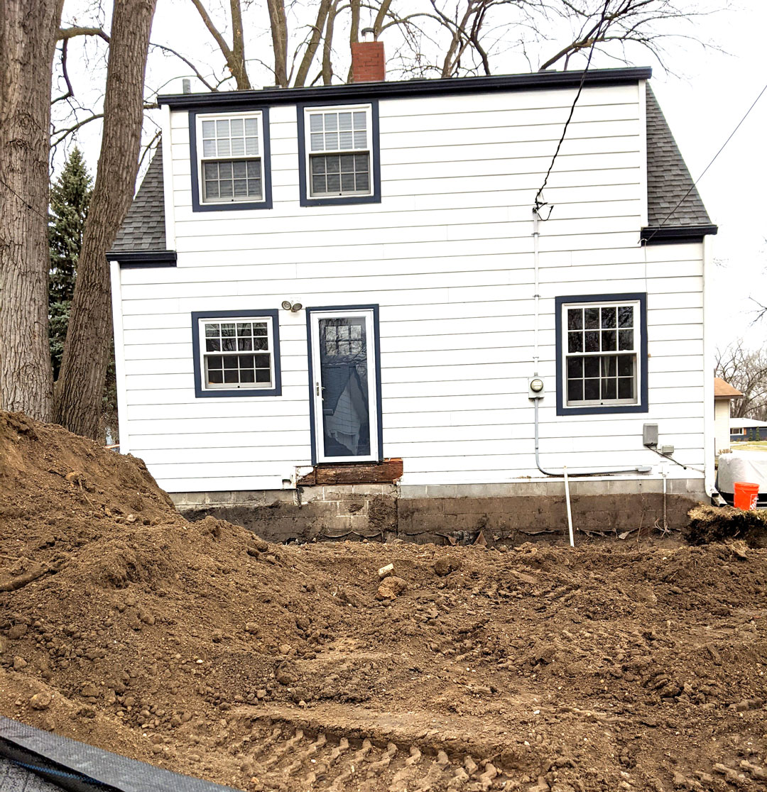 The next step is digging a hole for the new addition full-height basement foundation. Because the house was once moved from Robbinsdale to a new foundation in St. Louis Park, the eight-foot ceilings in the basement are taller than the neighborhood average. Heavy machinery removes the dirt behind the house, creating a hole large enough for the foundation. Once the digging for the foundation is complete, a form is built for pouring the concrete frost footings. The footings guard against settling and slippage that can damage the new structure.
