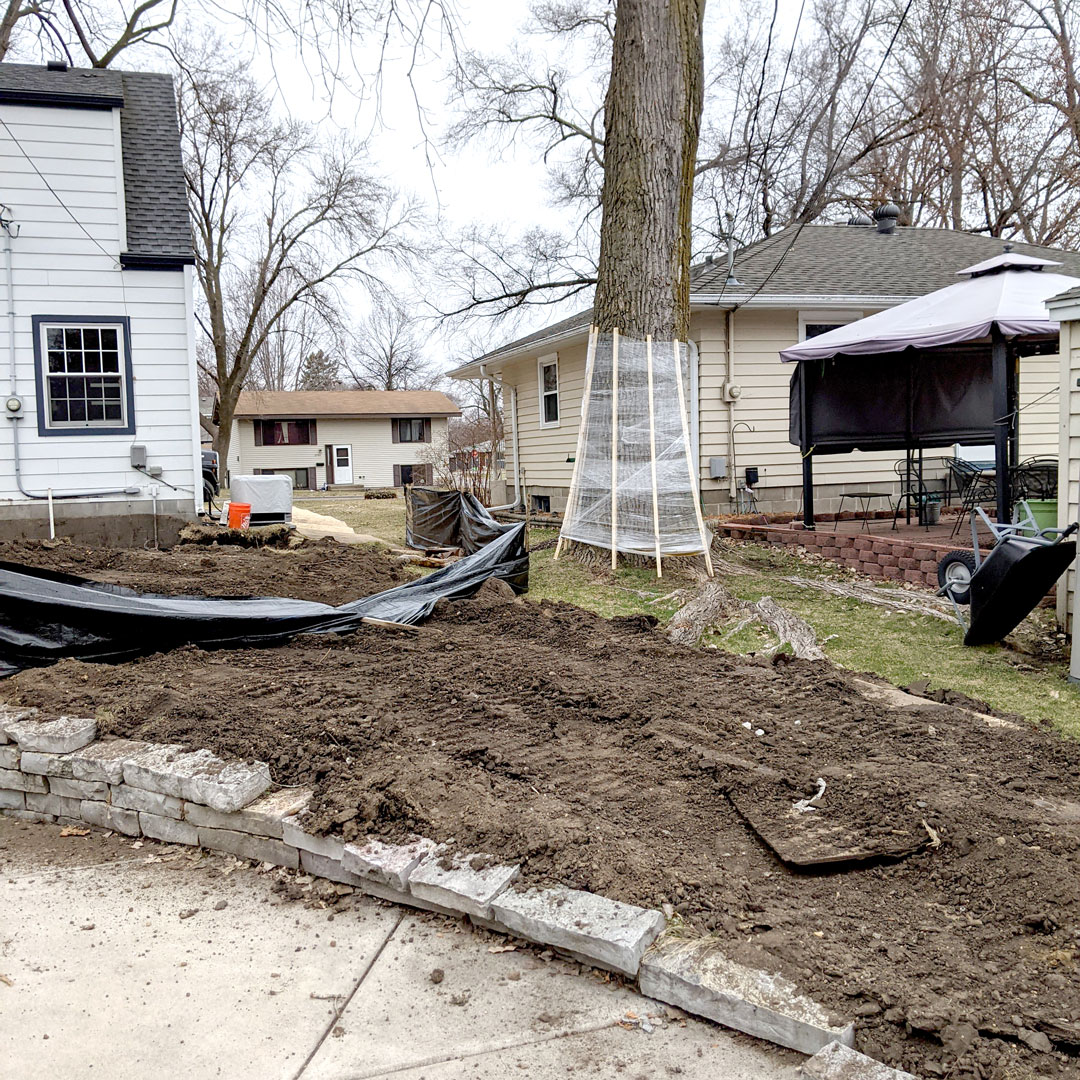 he next-door neighbor's tree sits right at the property line. Before construction started, we consulted an arborist to make sure digging the foundation wouldn't damage the tree roots.