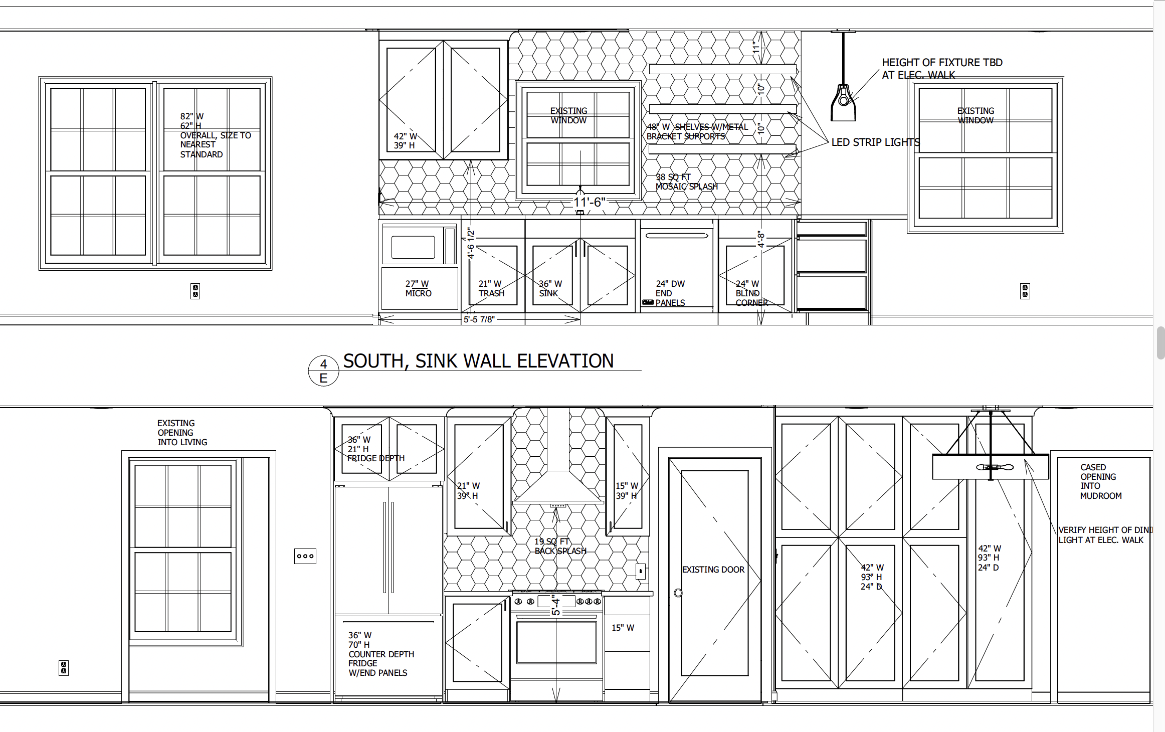 North and South elevation drawings of the kitchen show locations for cabinetry, appliances, and fixtures.