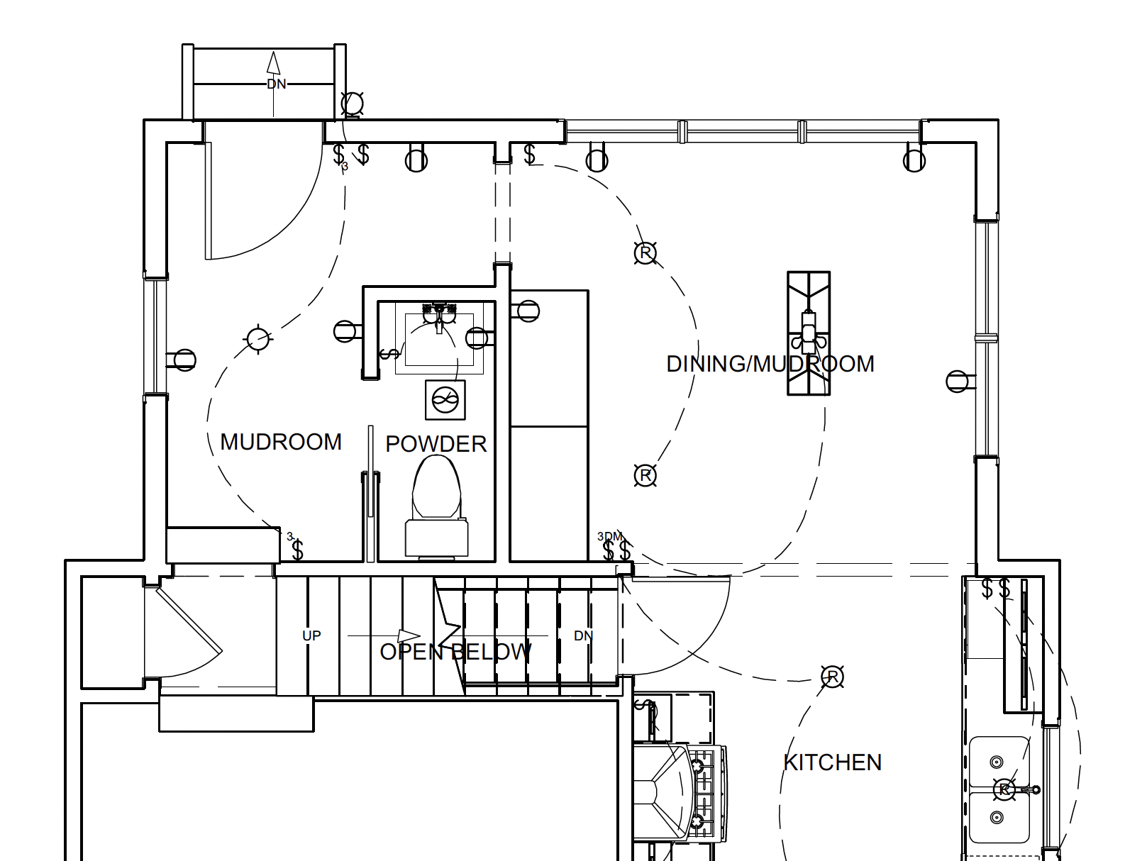 The addition makes space for a new powder room and mudroom that opens to the dining area and a new door with backyard access. There is also a passage from the mudroom over the stair landing into the living room.