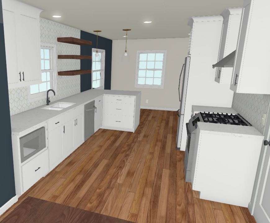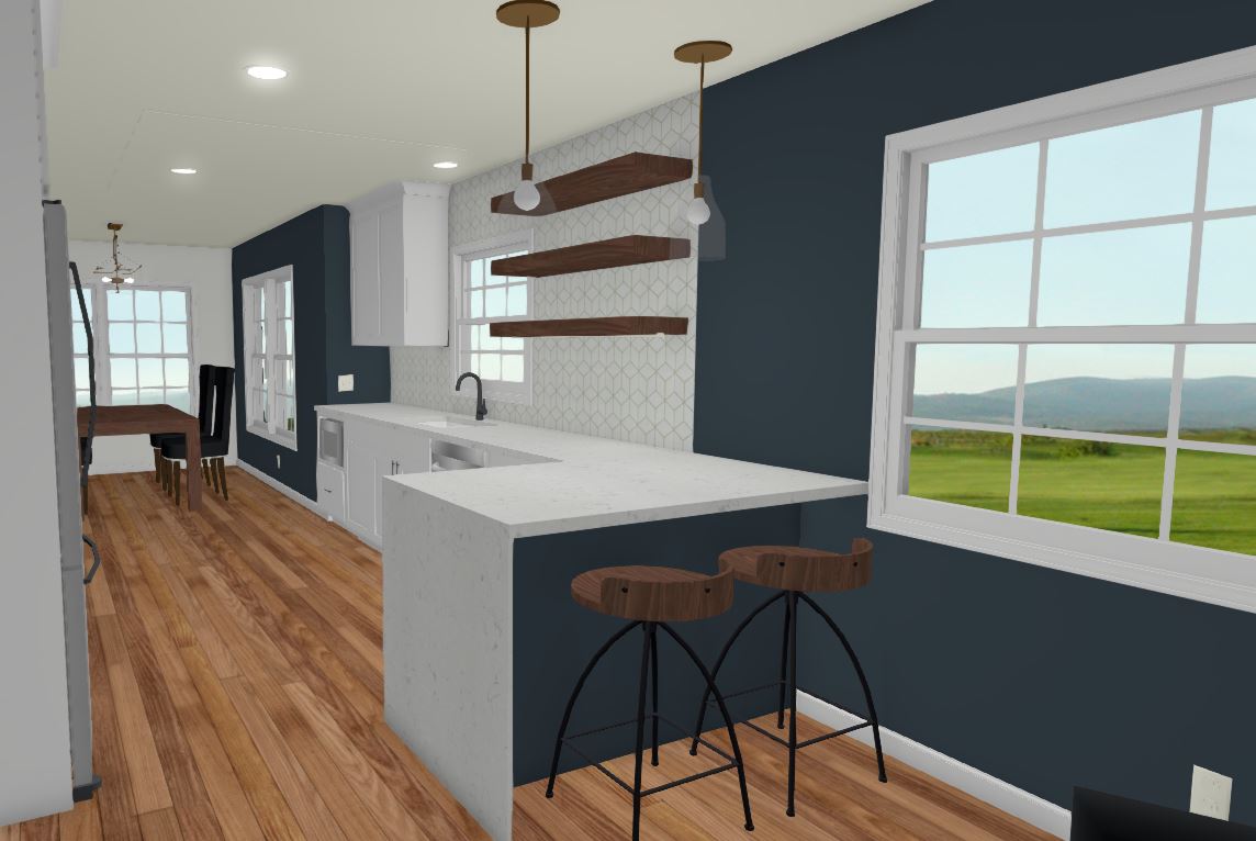 The new kitchen peninsula has a waterfall countertop, seating area, and storage with a hidden push panel door. The kitchen will have some upper cabinets but will also feature custom floating walnut shelves.