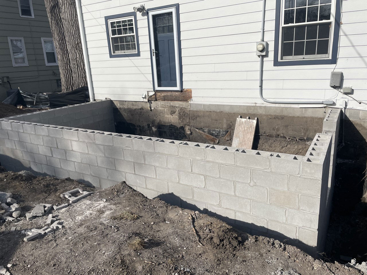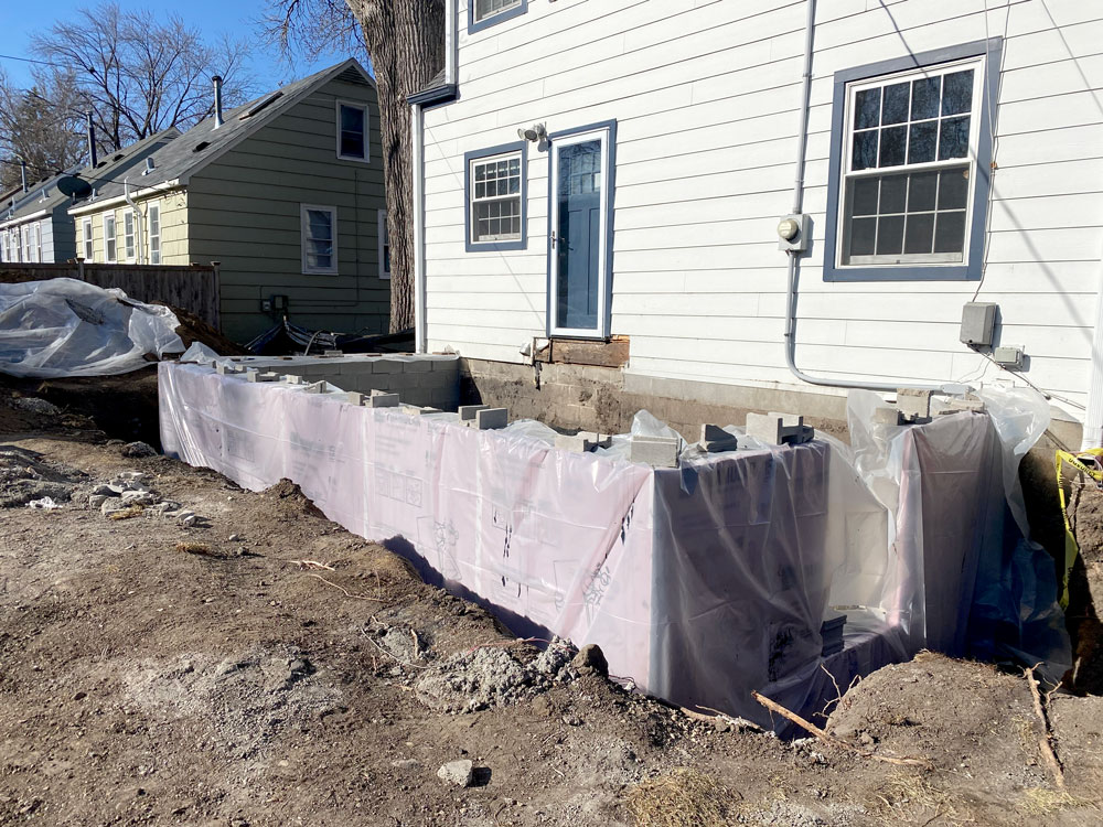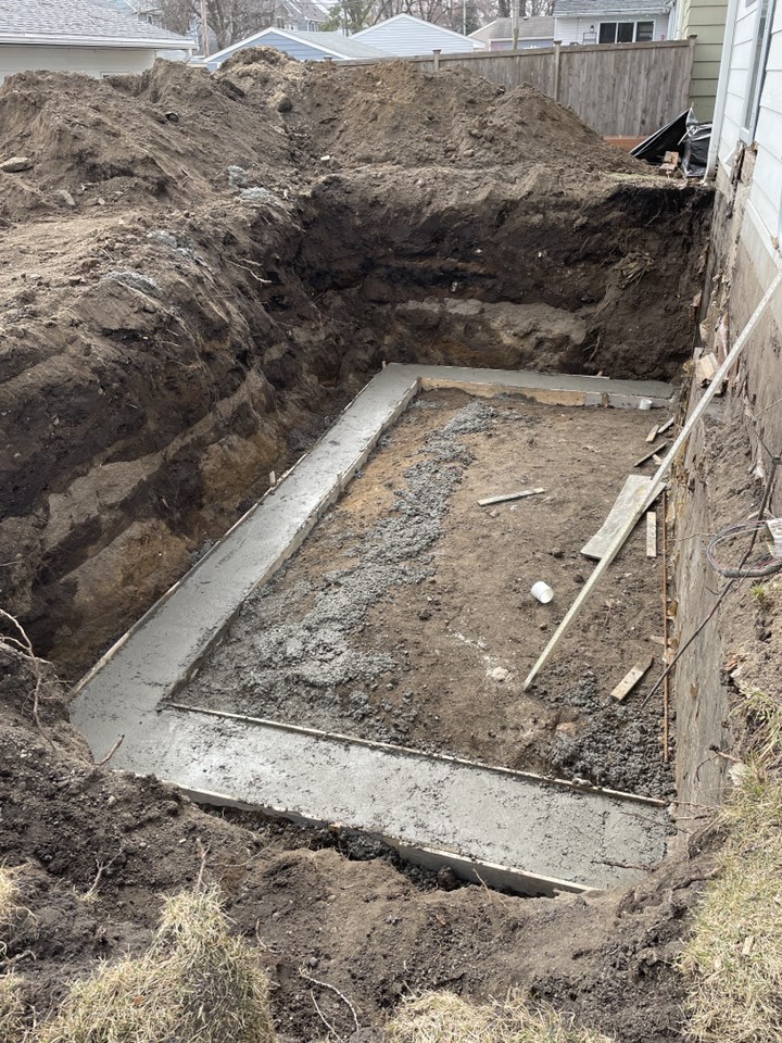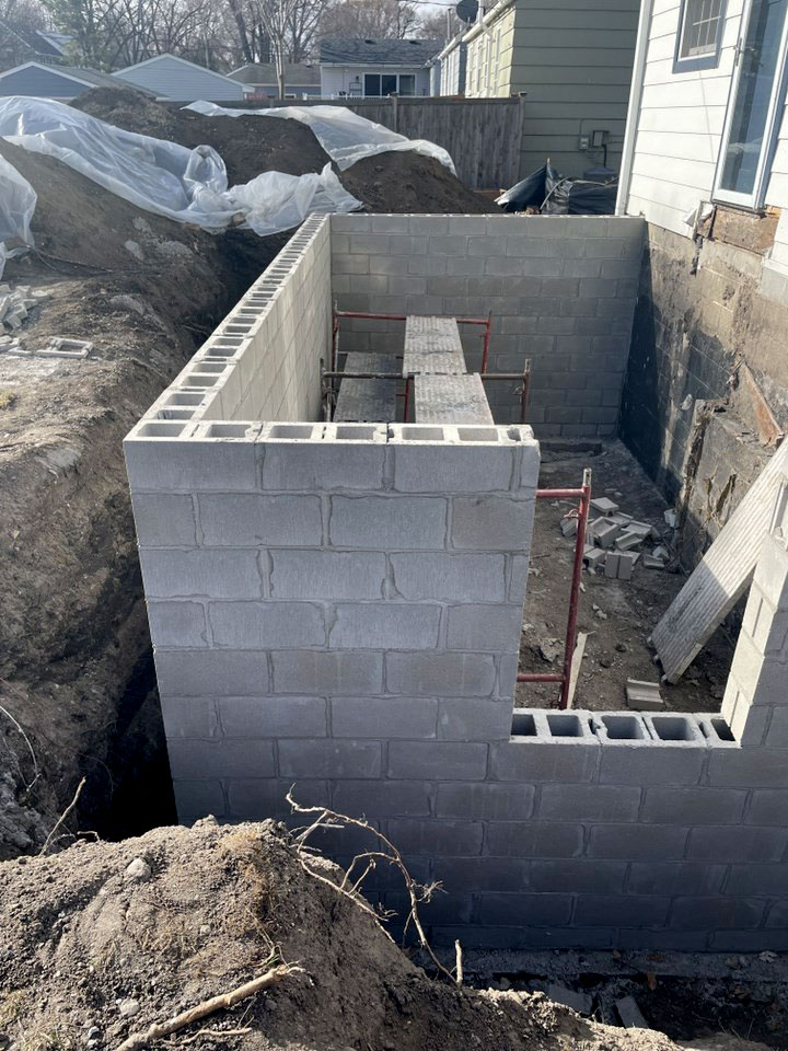 It’s time to build the new addition foundation! Freezing Minnesota winters and hot summers can cause the ground under the foundation to shift. Concrete is poured into a wooden form to create frost footings to support the new addition. Building the footing below the frost line helps prevent settling and soil movement called frost heave that could damage the new structure. Once the concrete is set, it’s time to lay the block.