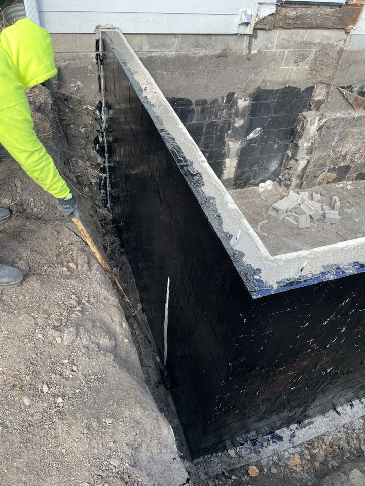 Rigid pink foam insulation is added to the foundation exterior. Now that the foundation is complete, framing can start!