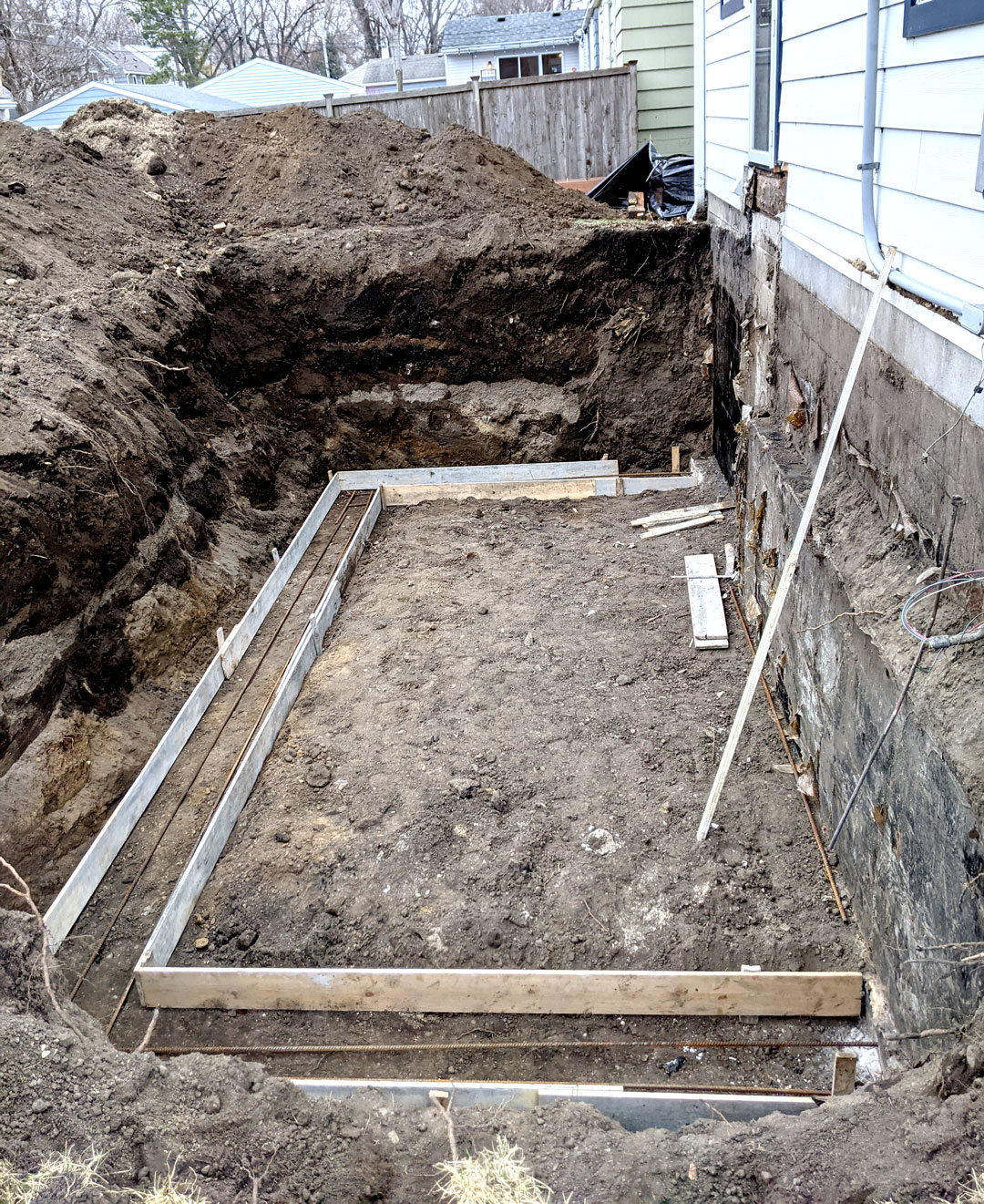 The excavated area is prepped with wooden forms for pouring the frost footings.