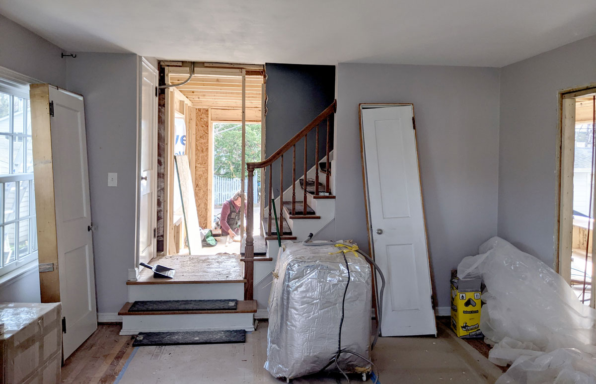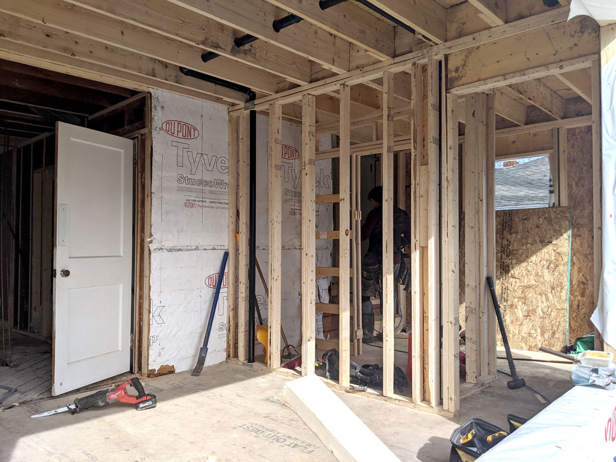 A look inside the framing for the addition first floor shows the wall between what will become the expanded kitchen/dining room and the new powder room. A doorway leads to the moved back entrance and added mud area.