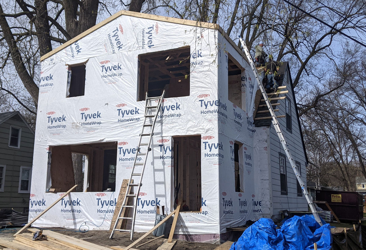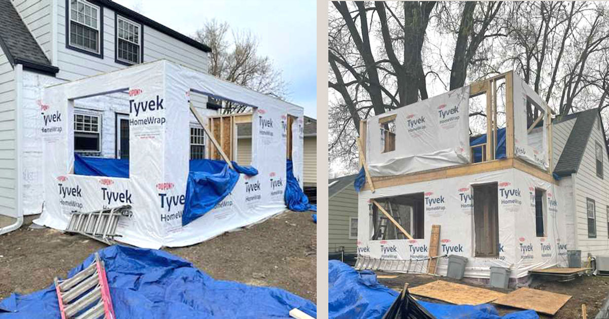 Framing starts in the backyard on the first floor of the home addition, which will add a powder room and mud area while increasing the size of the kitchen/dining area. Then comes the second-floor addition framing for the primary bedroom suite, installing the roof trusses, and finishing the addition roof. Once the addition is framed, we’ll remove interior walls on the back of the house, opening the home to the new addition. Adding house wrap before the siding helps prevent air and water from seeping in and lets moisture out.