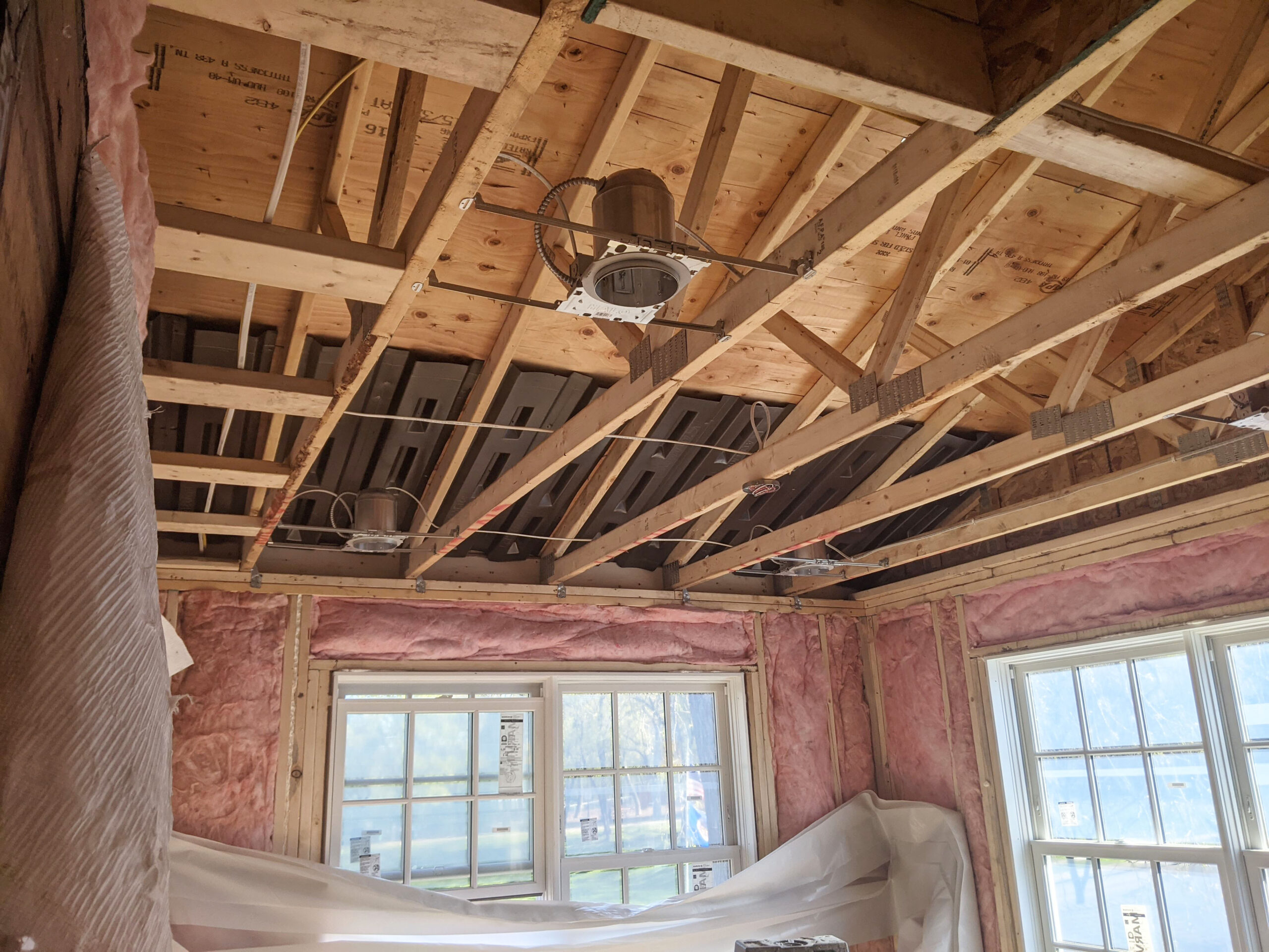 A peek inside the addition's trusses showcases the housing for the new recessed cans roughed-in and ready for the upcoming finishes. Notice how the framing provides the right cavity space for the home's new insulation.