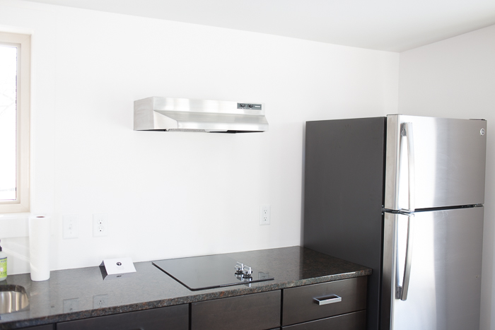 The Kitchenette refrigerator, dishwasher, cooktop, and vent hood are installed.