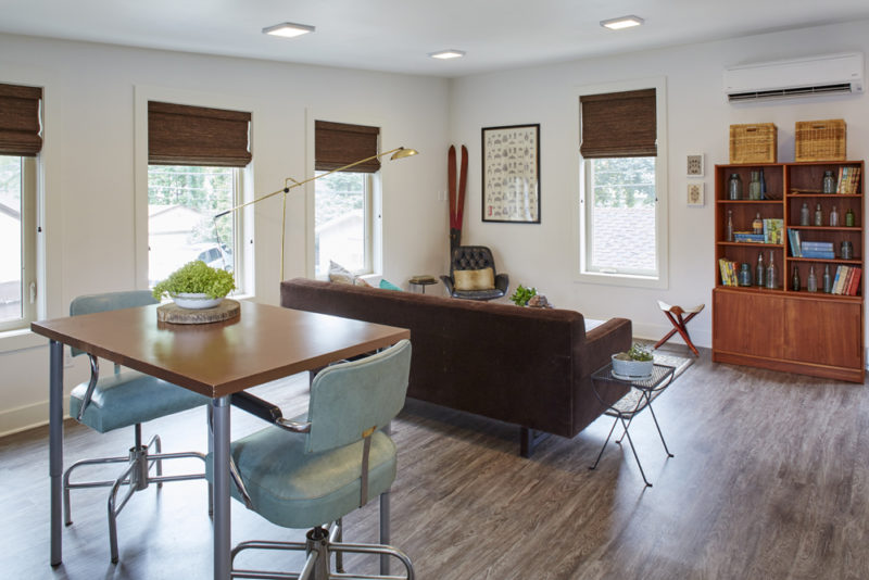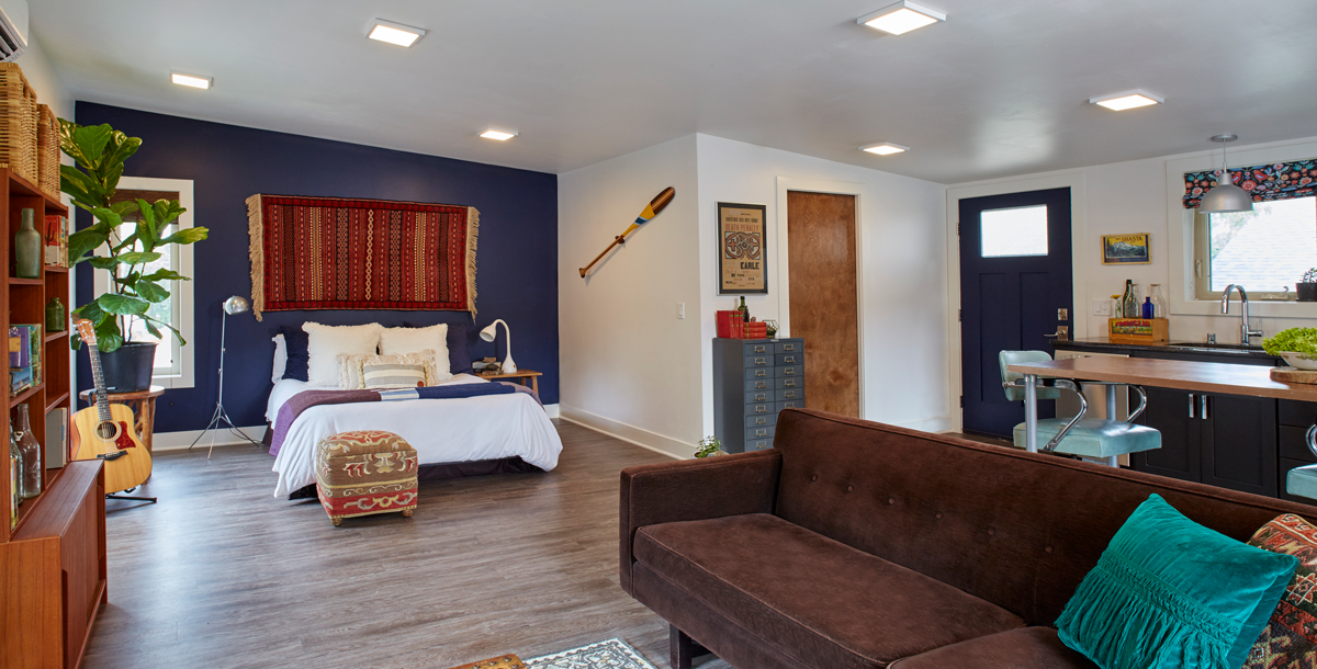 Cate and Jason were able to furnish most of the new ADU garage studio apartment with items they already had in their home, creating the separate living, cooking/dining, and sleeping areas. The open floor plan and layout allows for flexibility if they want to change the way they use the space in the future. ADUs can be used in many ways including long-term rental, short-term rental (Airbnb), home office, or as independent living for a family member.