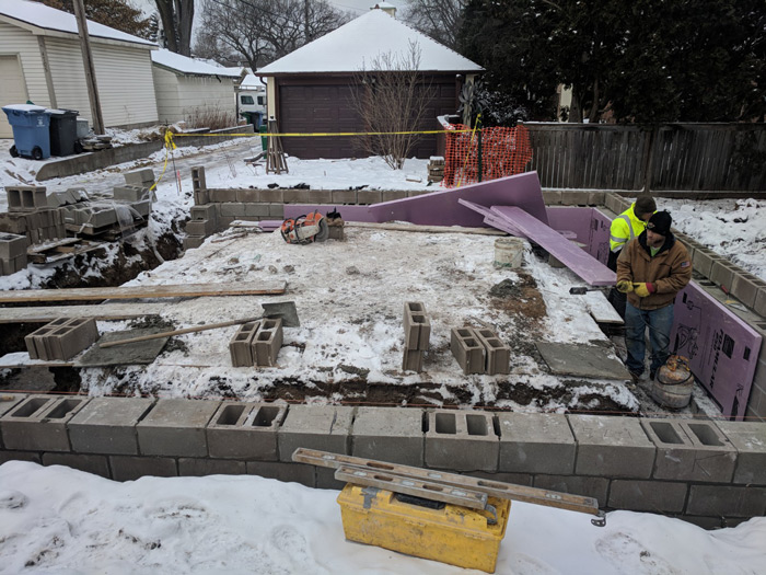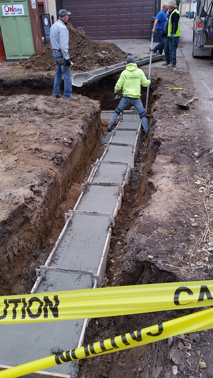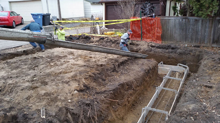 Pouring the footings. Per code, footings in Minneapolis must be between 54 and 60 inches deep.