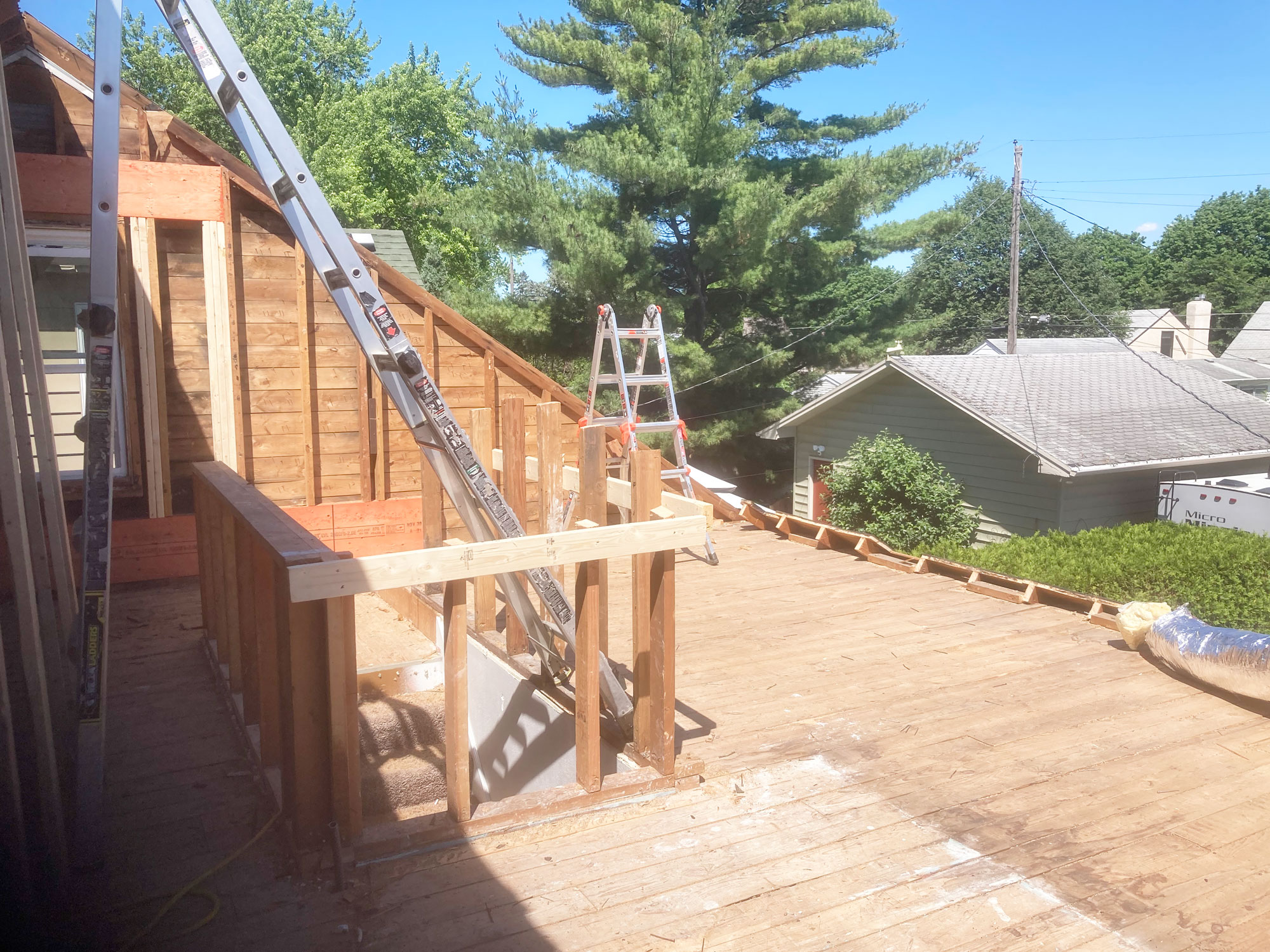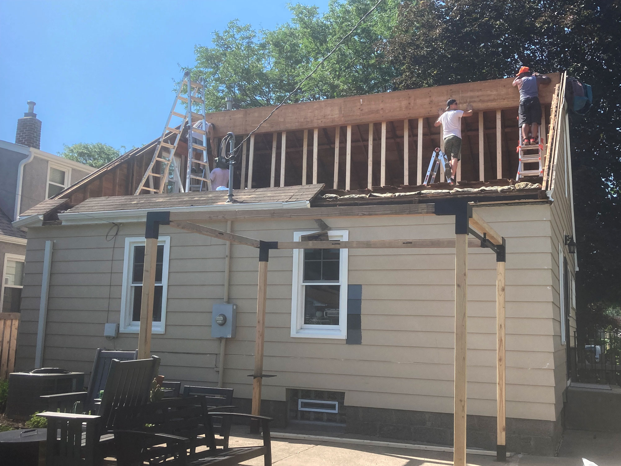 Before wall framing could start, our team installed the required lvl beams above the existing upper-level windows. This freshly demolished roof is the starting point for building out the new shed dormer.