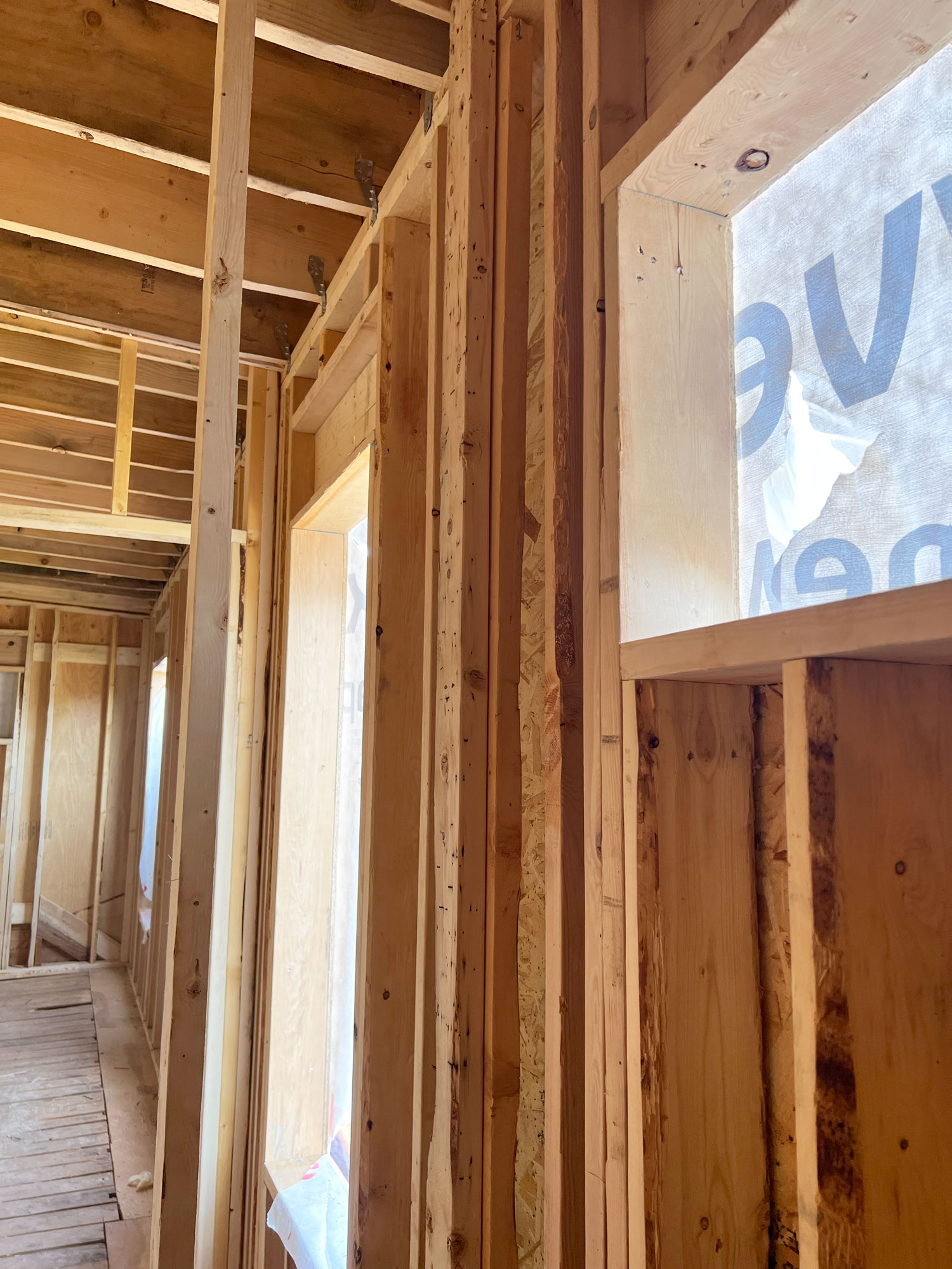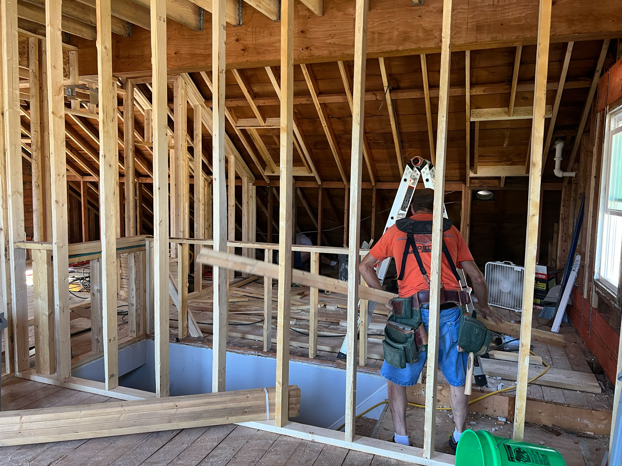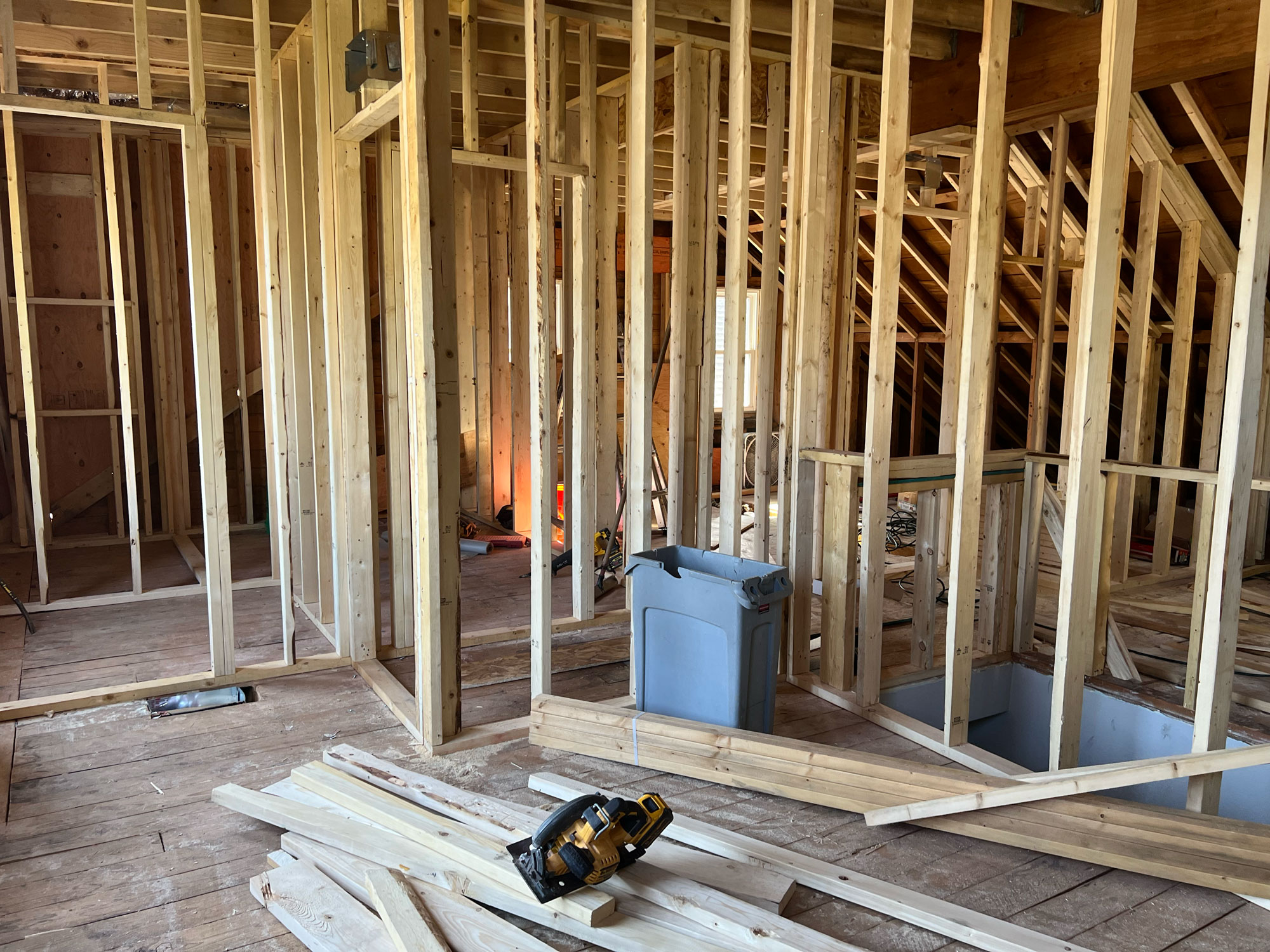 Except for plumbing walls, the interior of the home is composed of dimensional 2x4 lumber, while the exterior is entirely composed of 2x6s to ensure the proper wall depth to properly insulate the home. Like many other homes, this framing consists of vertical lumber screwed into a top and bottom plate at 16" on center. Framing for the skylights is done on the interior while the roof will be removed only when the skylights arrive.