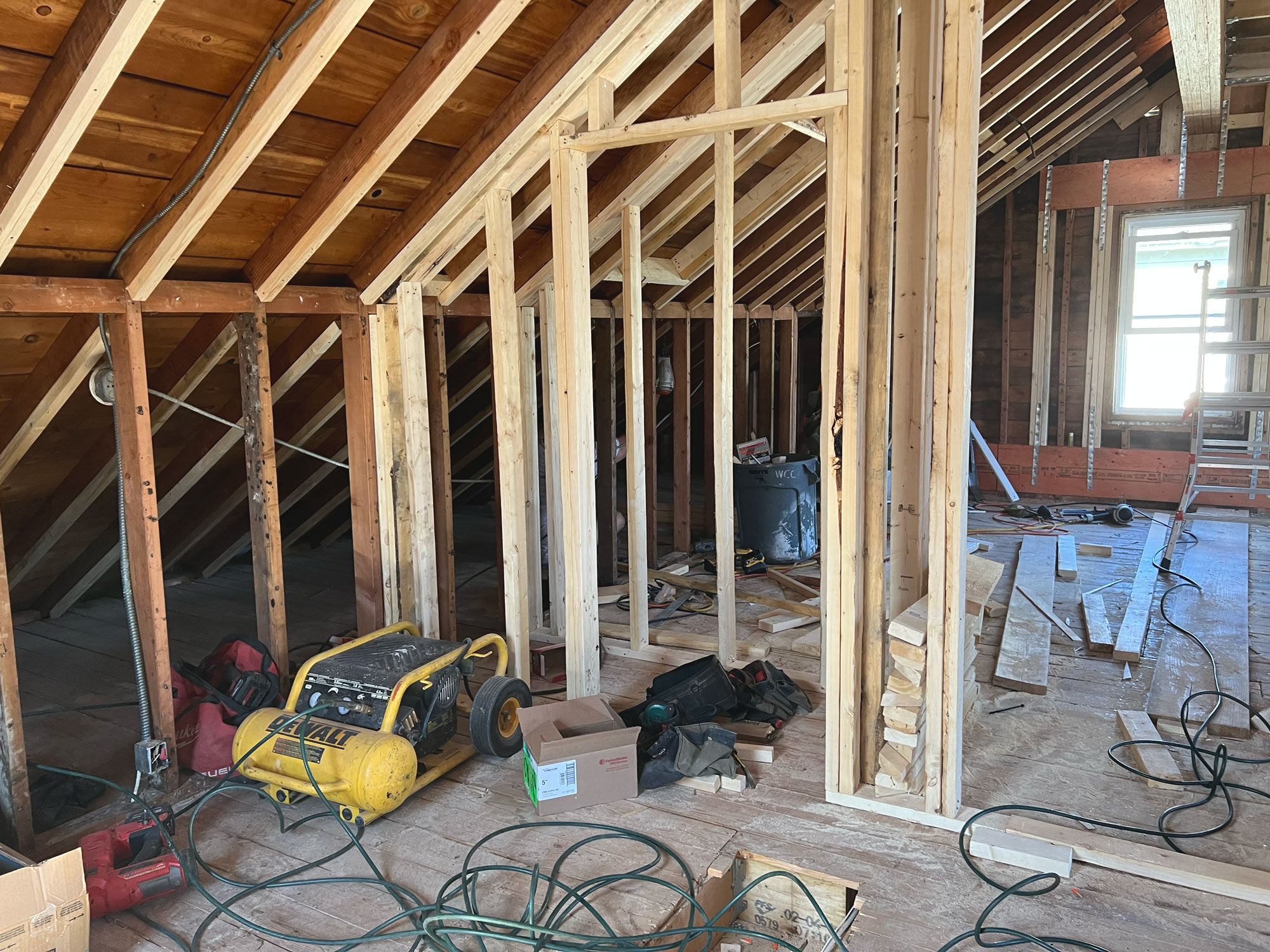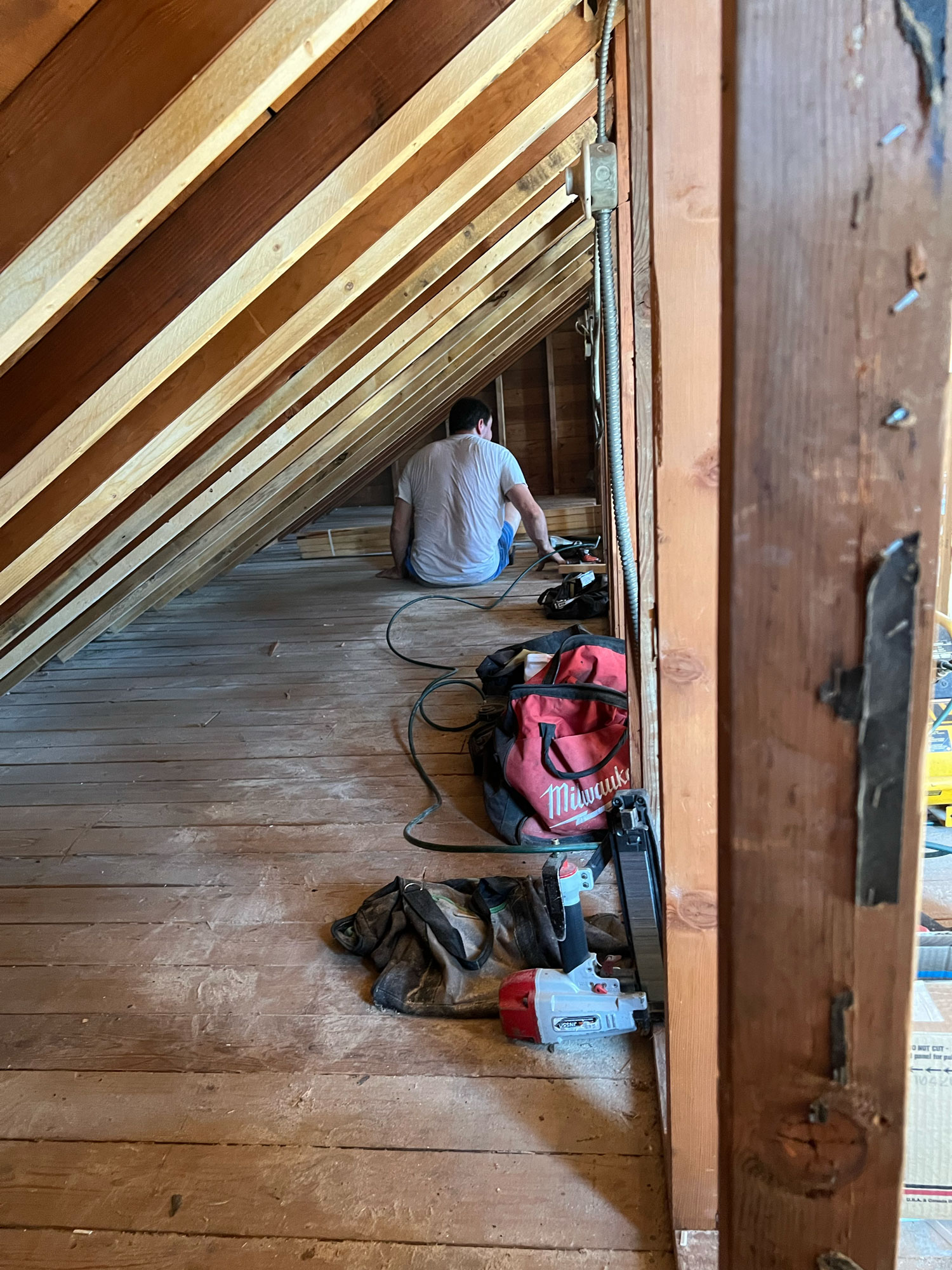 Along the existing rafters, we've added some additional framing to ensure a few extra inches of insulation space. Though it doesn't seems like much, an extra inch or so will make a big difference in both retaining heat in winter and keeping the upper level cool during the summer months.