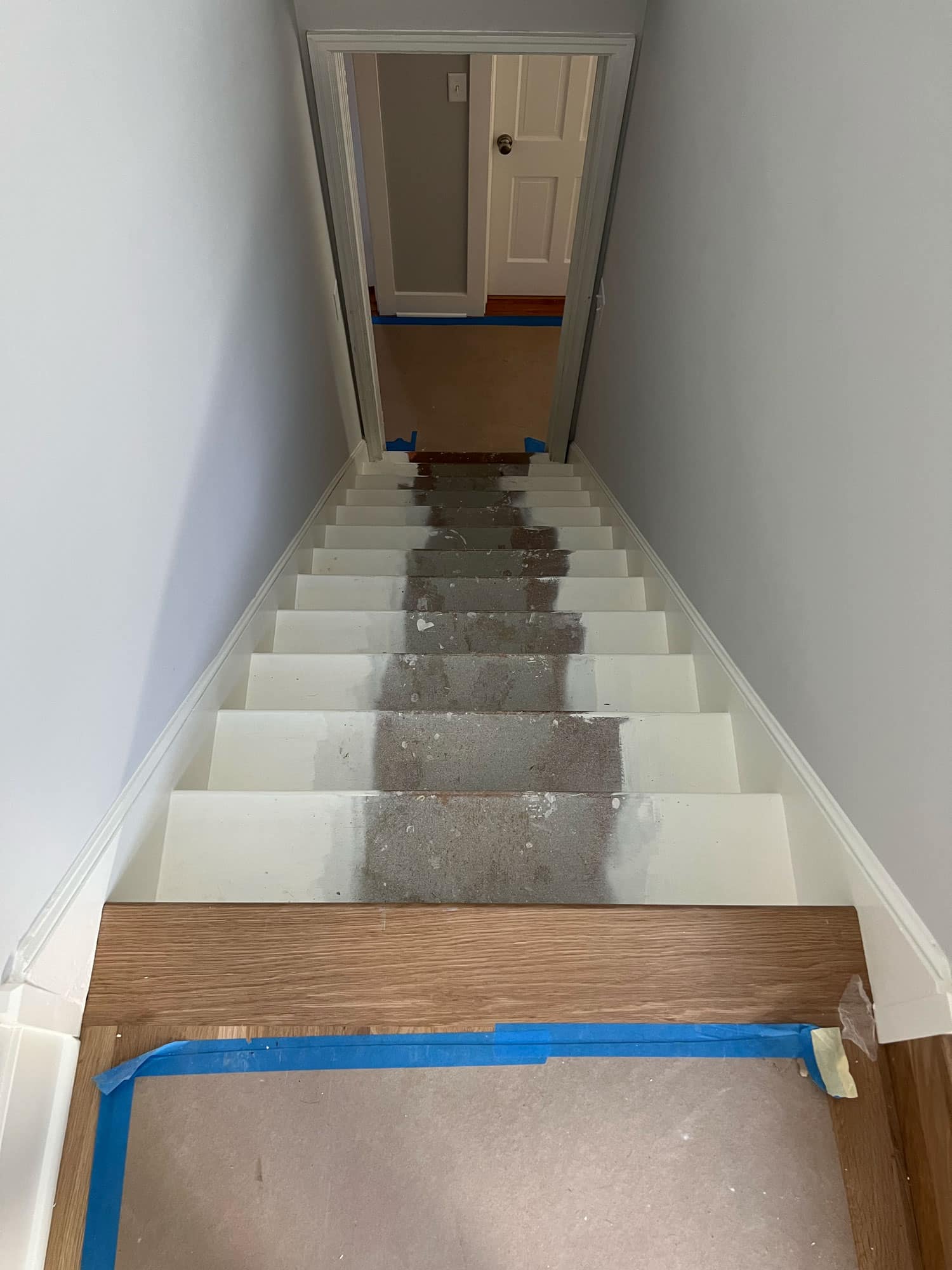 Our painters matched a warm white on the lower level for the stair treads and risers. Soon we'll install a 24" carpet runner to sit atop each step.
