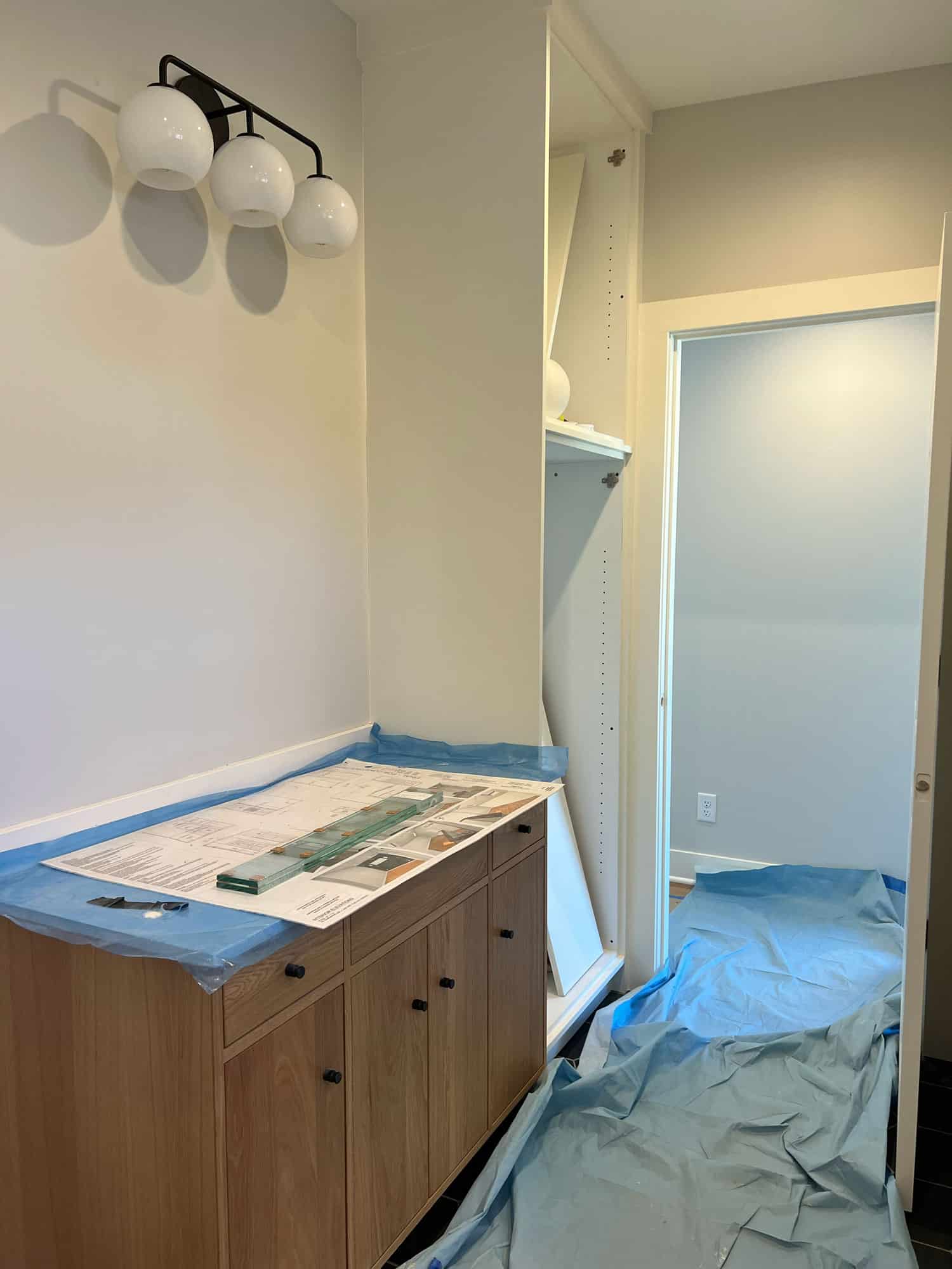 With the cabinets installed, we moved forward with painting and installing West Elm's 3 globe sconce just over the vanity.