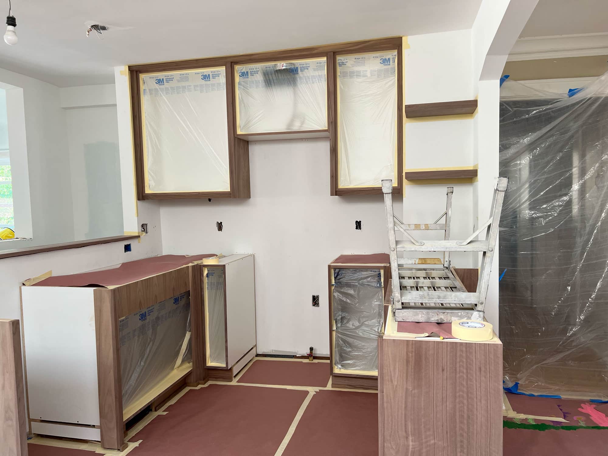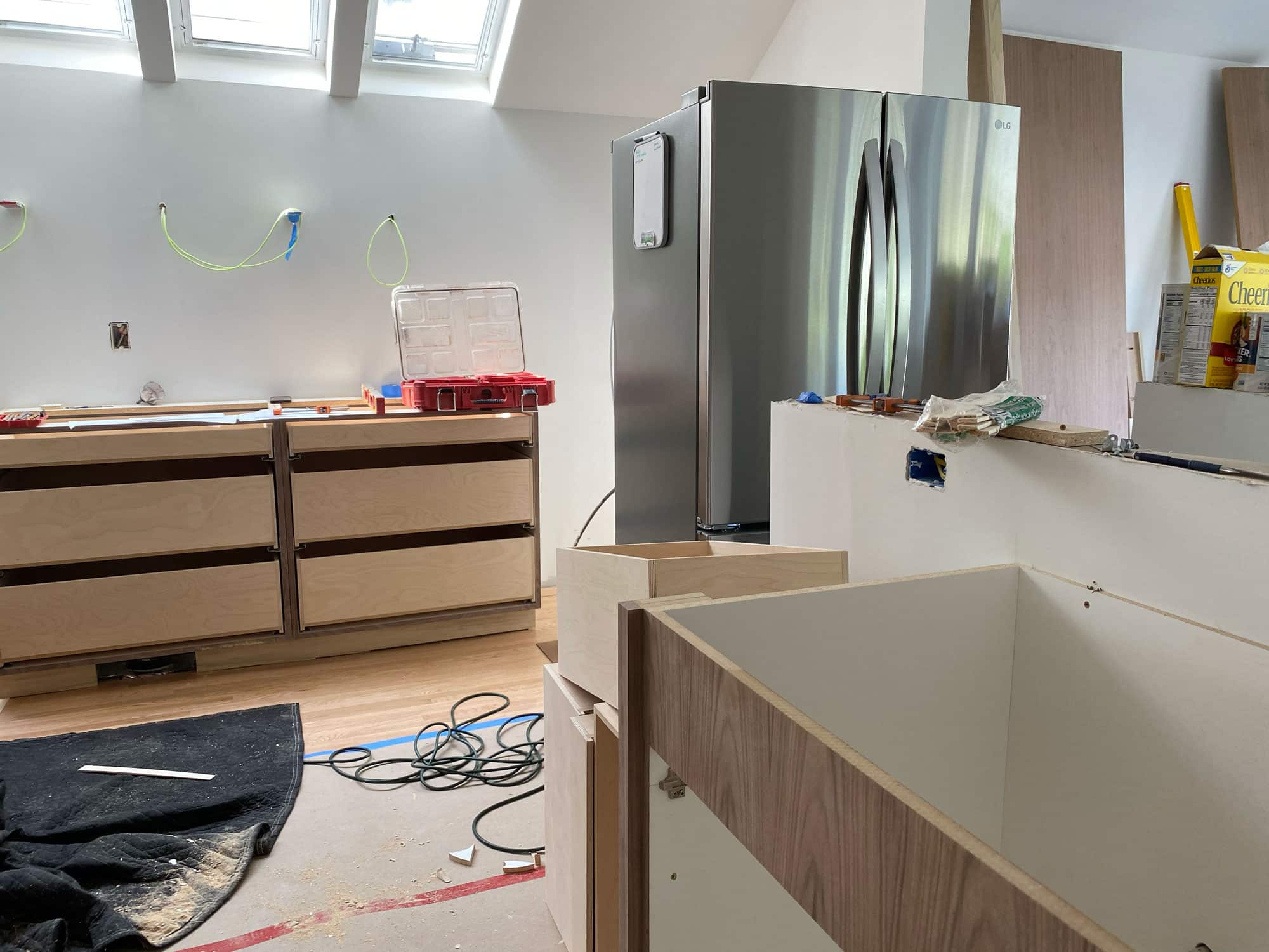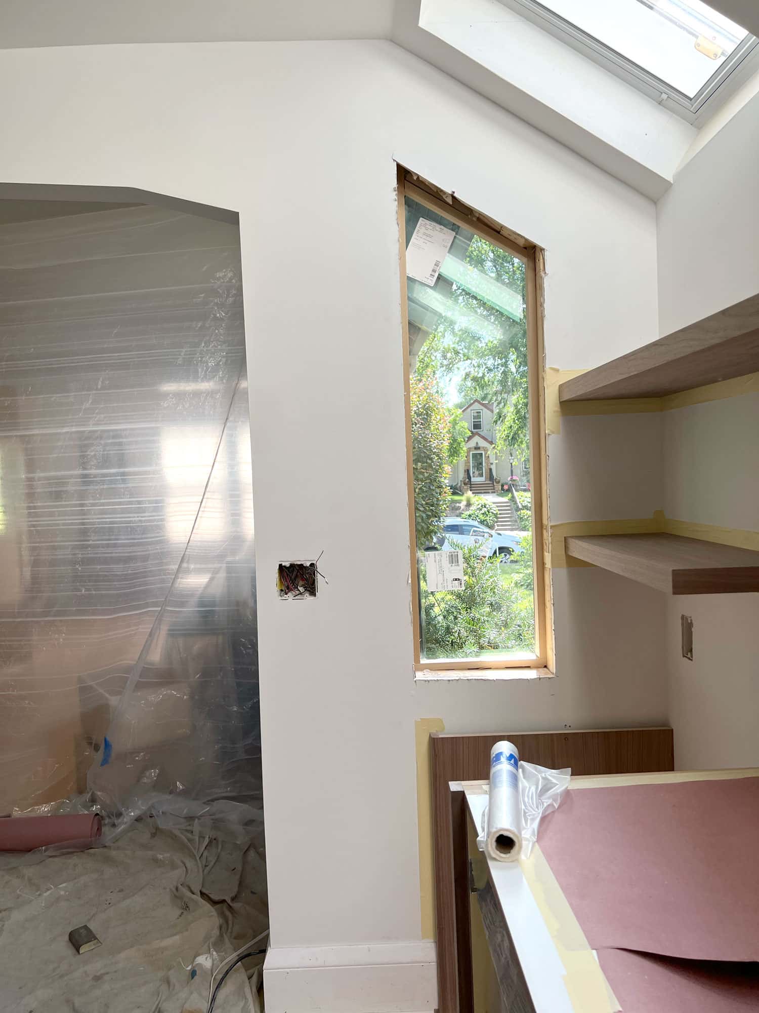 Just under the skylights, electrical wiring projects from the wall surface where open shelving is just about to be installed. The wiring will be pulled along a track hidden in the walnut boards to supply necessary task lighting.