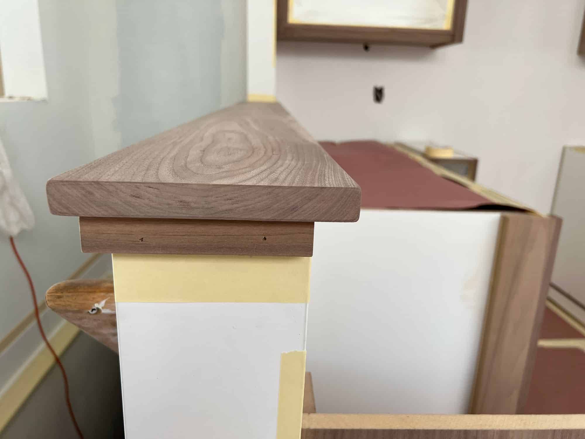 A clear coat sealer will be applied to the walnut cabinetry and millwork, like this wood knee wall cap at the stair's edge.
