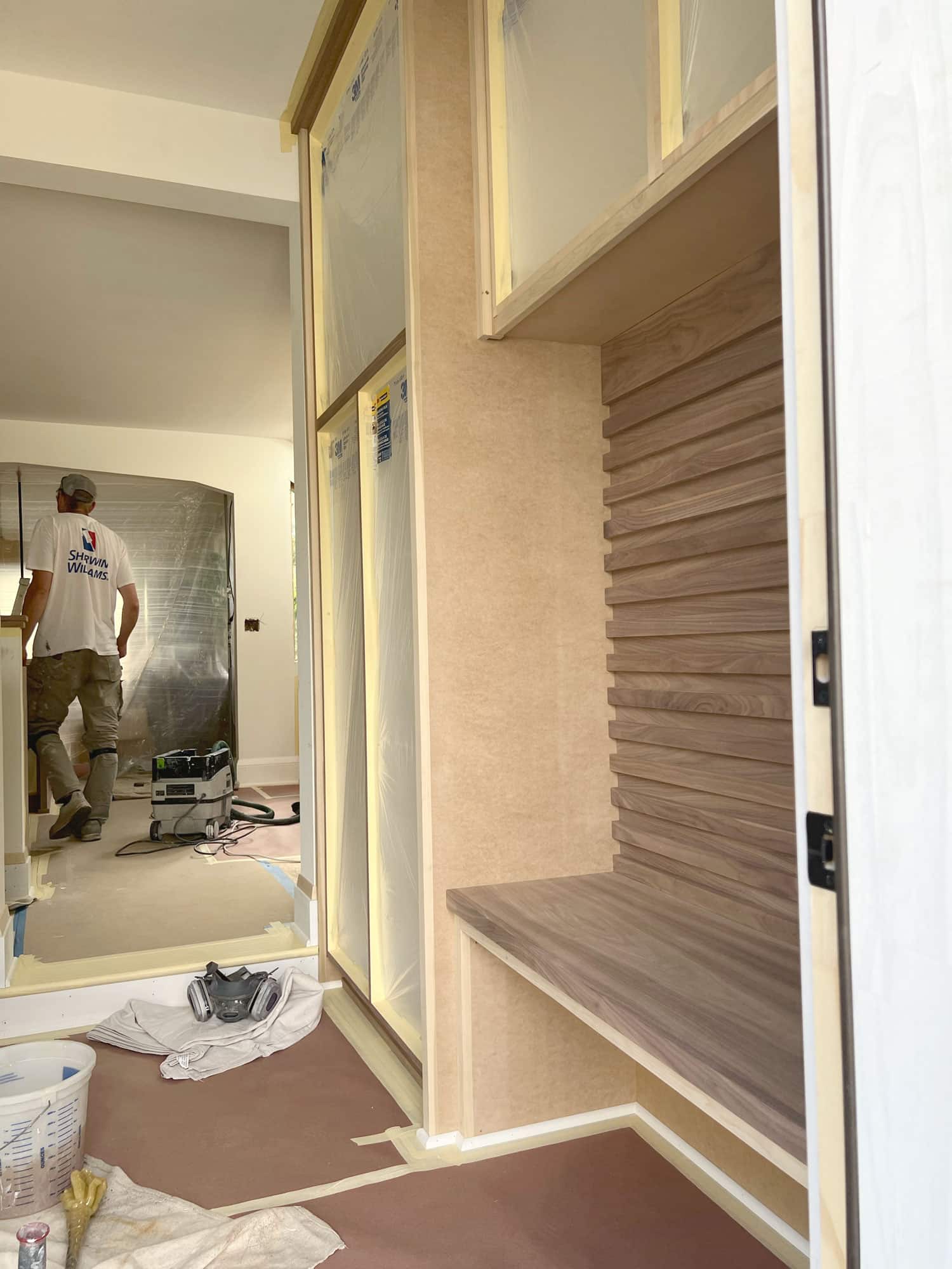 The new mudroom cabinets feature both walnut and painted cabinetry. Just off the garage entry, a walnut bench with a unique horizontal slat pattern will sit alongside vividly painted full height cabinetry, painted in Sherwin Williams, Sea Serpent.