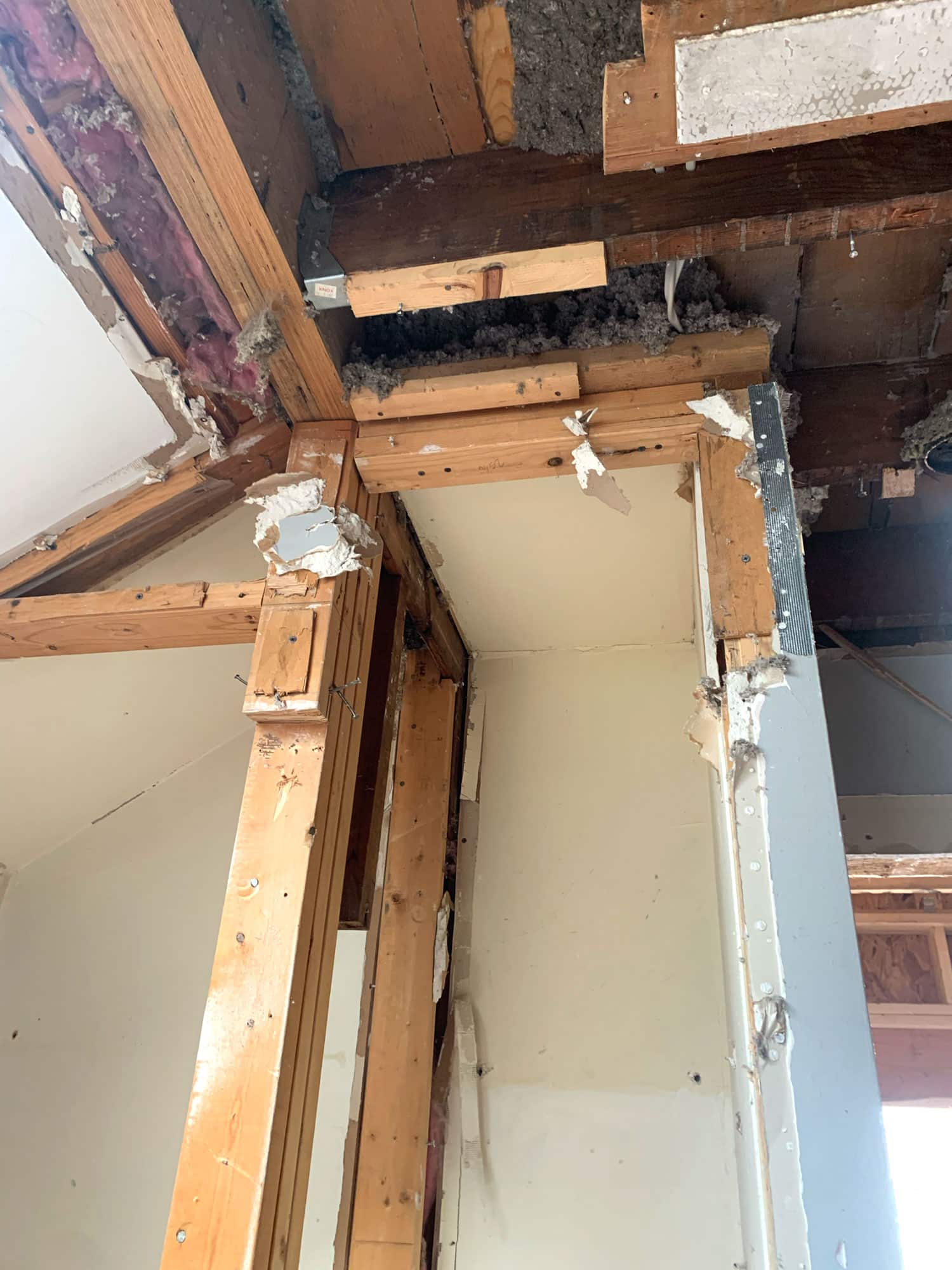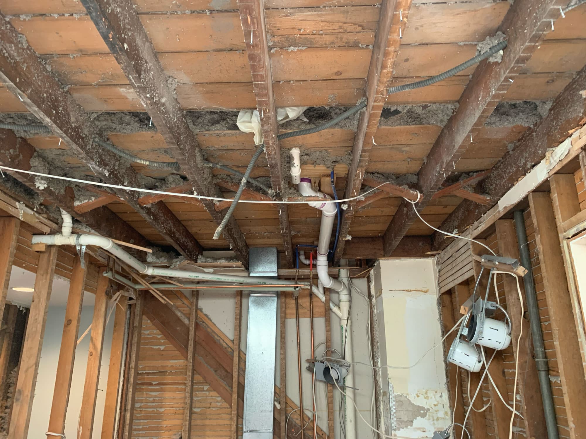 With the existing sheetrock on the ceiling removed, we can see the joists above and bracing between each. Later on, we'll revisit the lighting placement and install new cans between joists.