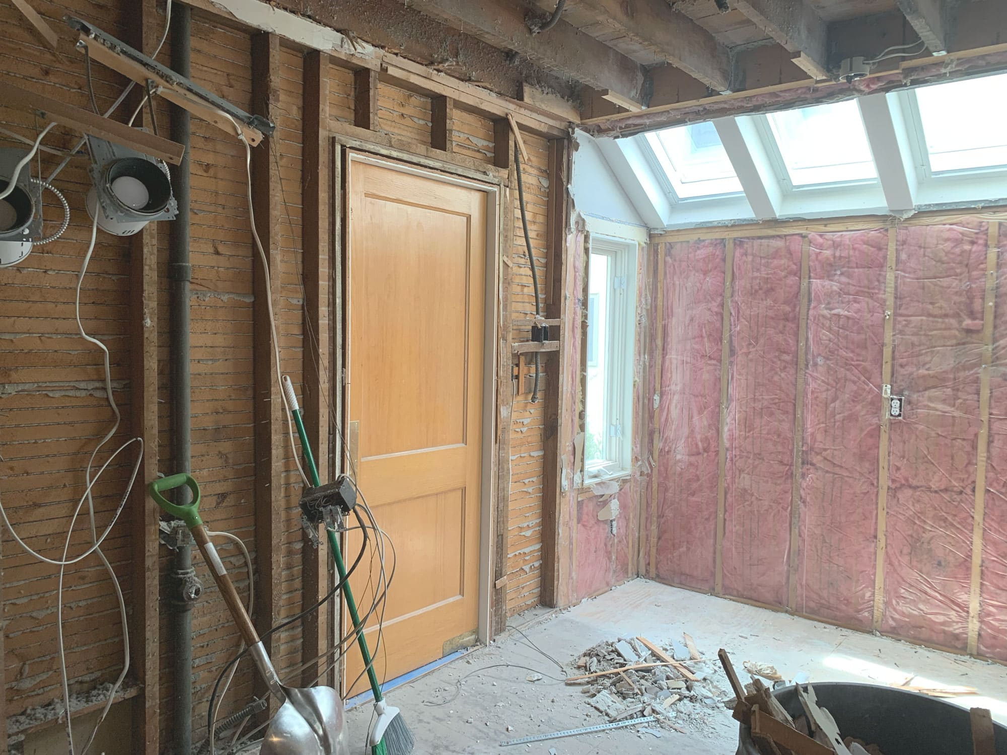 With the Walls down and the floor joists above exposed, sometimes you find a few surprises, like an unsupported beam. In fact, we’ll be adding 3 more LVLs at the location of the former kitchen closet, as the existing beam was short of the necessary bearing point, which could cause a structural failure. Our construction and design team specified all new LVLs to extended an additional 1.5′ passed the closet into the new mudroom. Though not the most fun reveal, these surprises are actually pretty beneficial. The greatest gift of a remodel, “Yikes – look what we found!” situation, is that our team can preemptively and effectively relieve an unseen issue before it causes big problems for the homeowners later on. We meet unexpected roadblocks with problem-solving and work with the homeowner to understand the problem and all possible solutions.