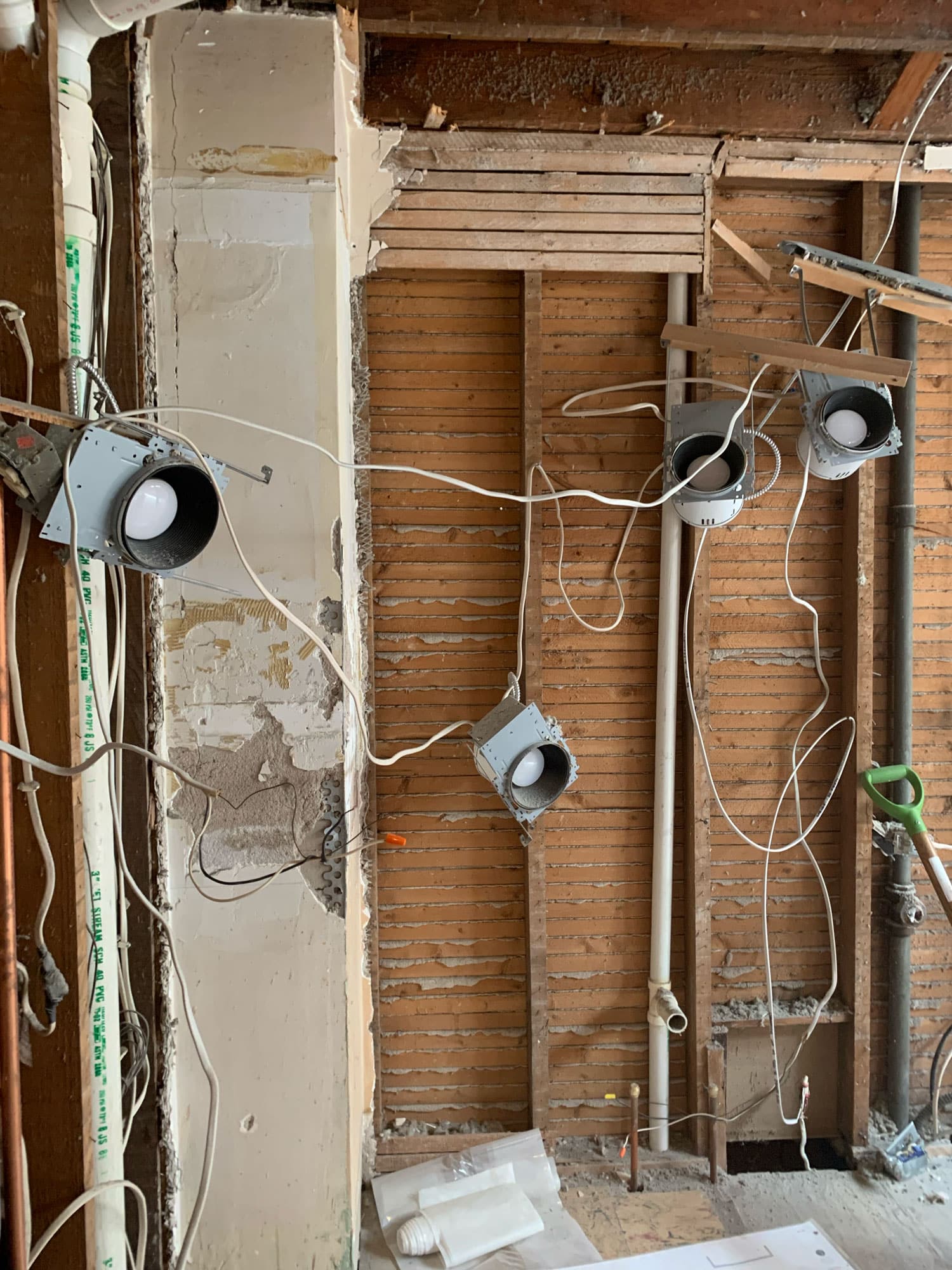 Recessed lighting cans are dropped form their position in the ceiling temporarily until new cans are tacked in during the electrical rough-ins soon.