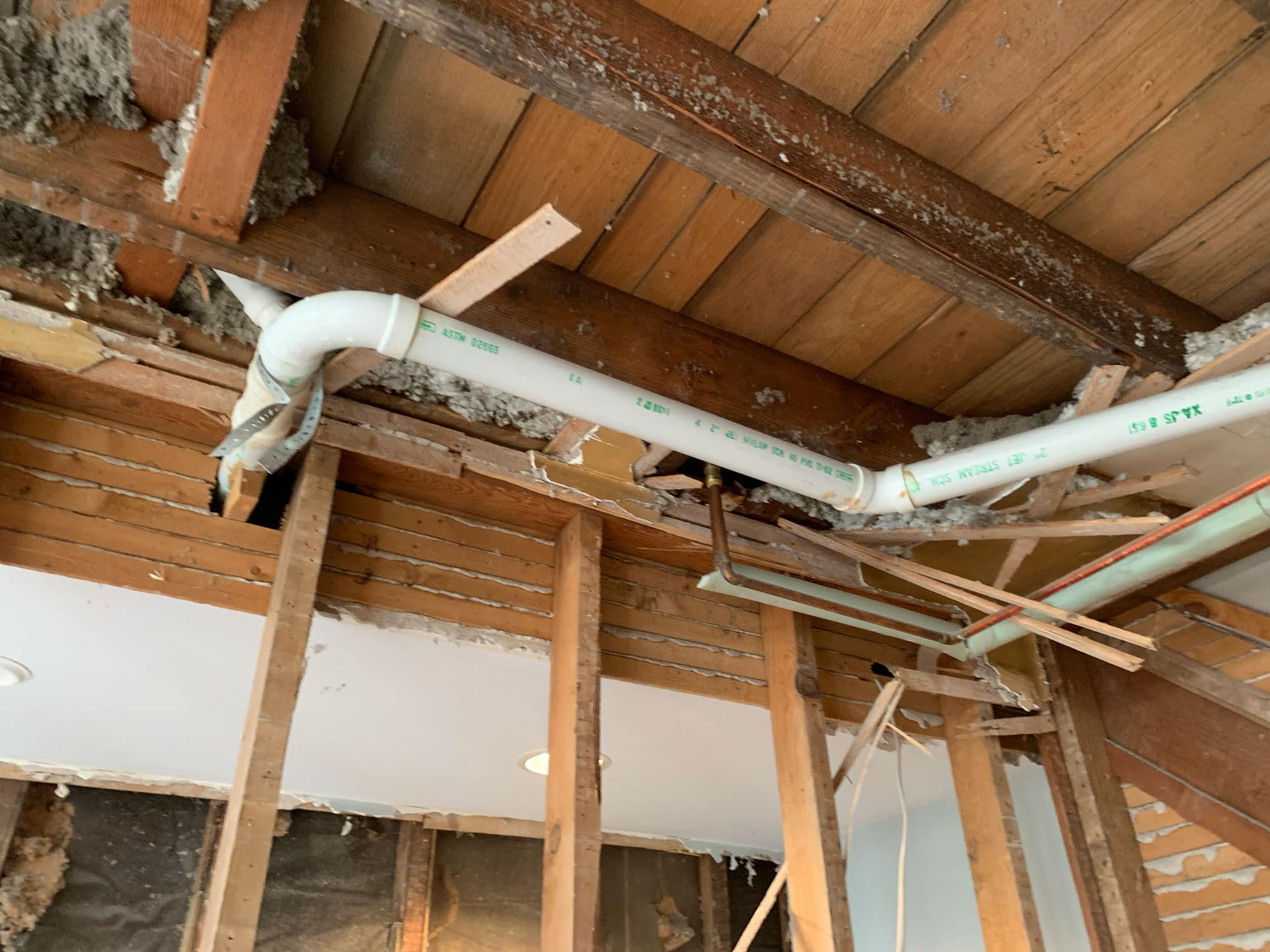 Cabinetry along the former range wall is ripped out, showing old plumbing, recessed cans, and an HVAC duct.