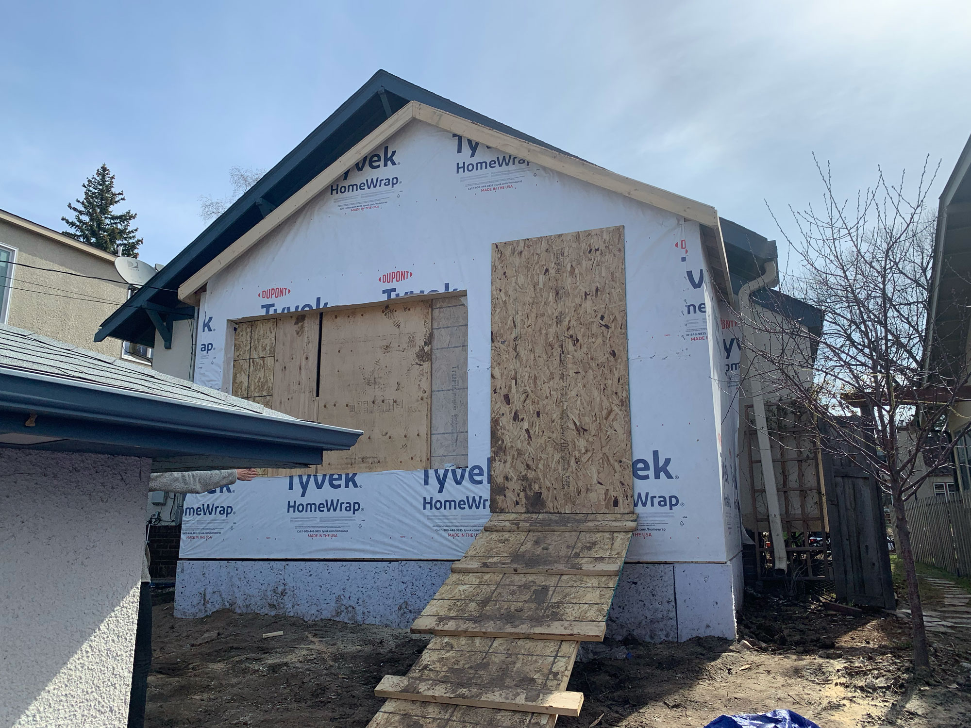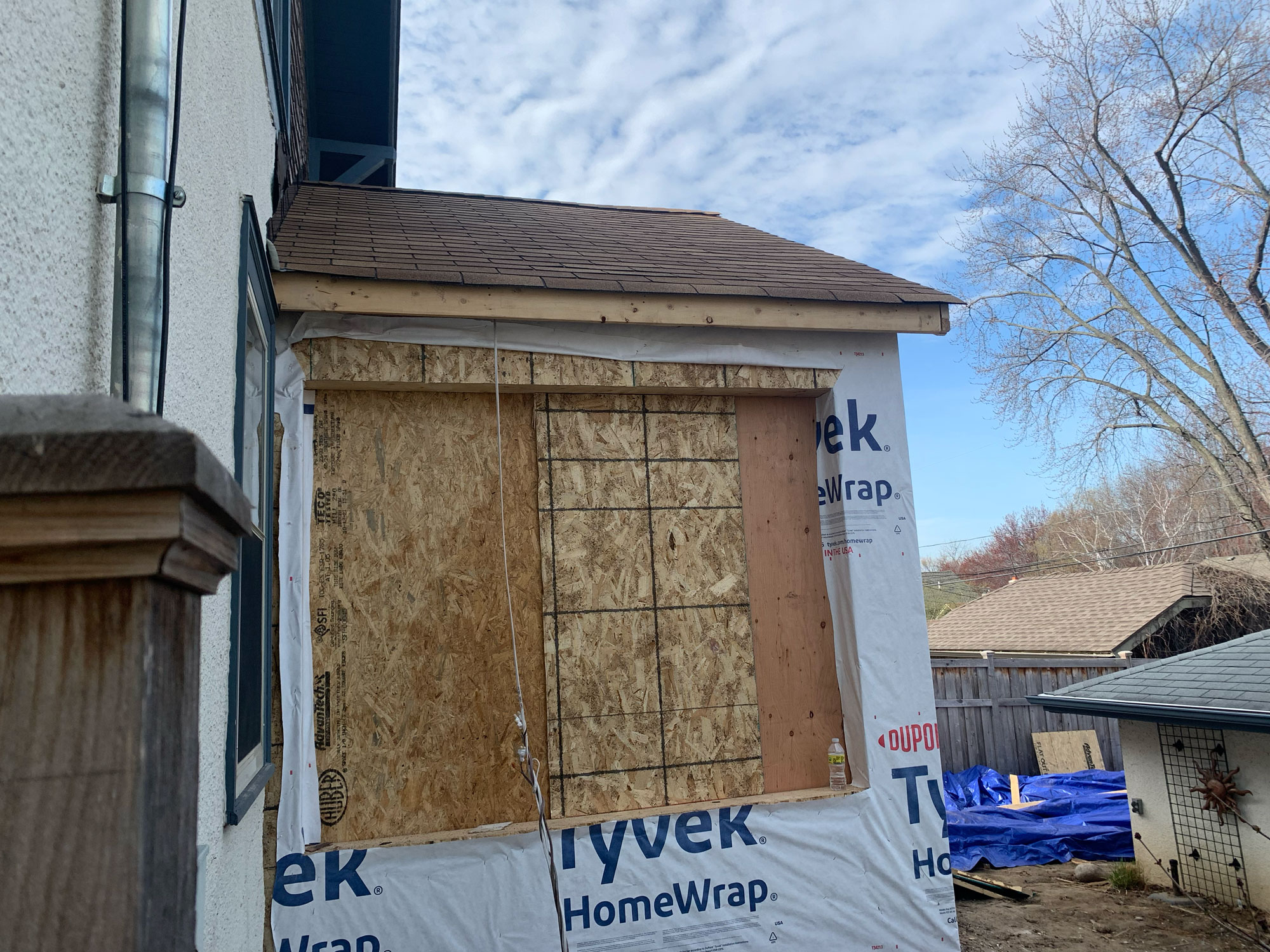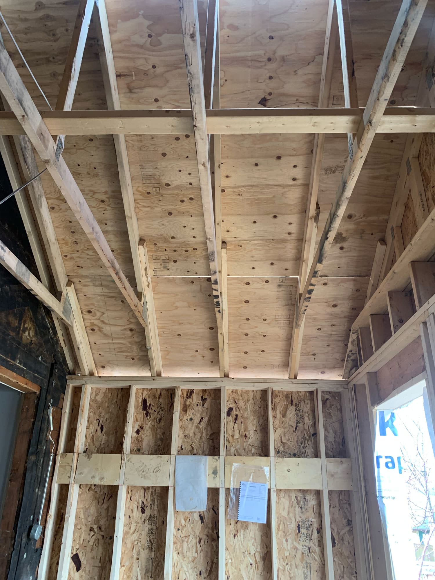 Sheathing and waterproofing on the exterior provide the necessary water barrier for interior processes like demo and rough-ins to begin.