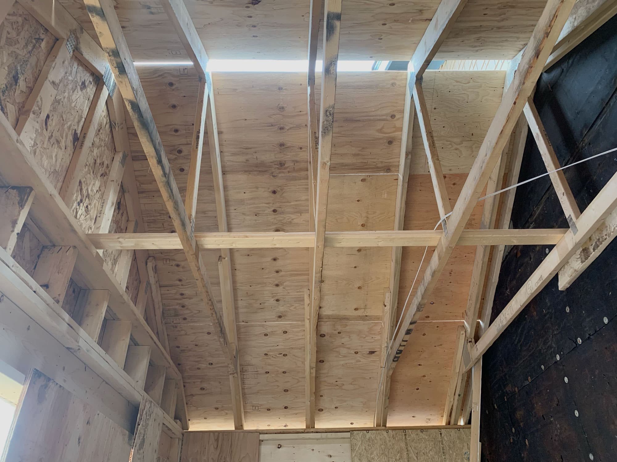 Once the exterior walls are up, the next step is to nail roof trusses along the top plate of those walls. Here we see the trusses above the mudroom space created by the addition.