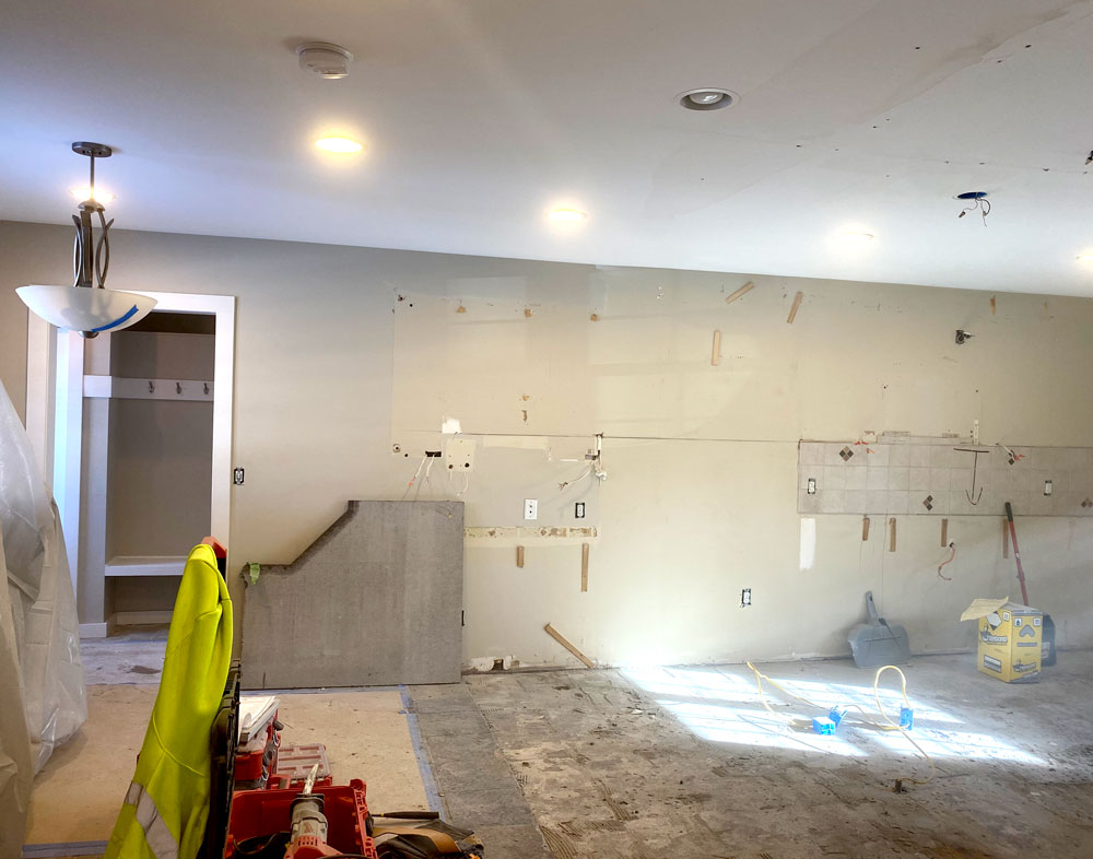 Our crew demos the existing kitchen, removing cabinets, countertops, light fixtures, appliances, and flooring.