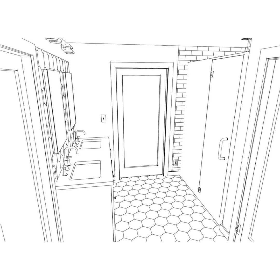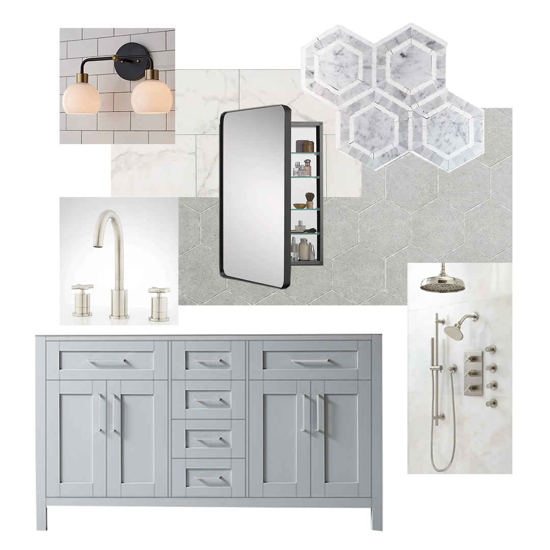 We’re transforming the 2nd-floor family room into the main bedroom and adding a new en suite bath. The luxe bath design features matte grey hexagon floor tile, marble hex pattern mosaic backsplash, and marble-look porcelain subway tile in the shower. The shower will have a multi-head shower system that includes a rain shower head and hand shower. We’re also adding a large free-standing soaking tub to the new bath.