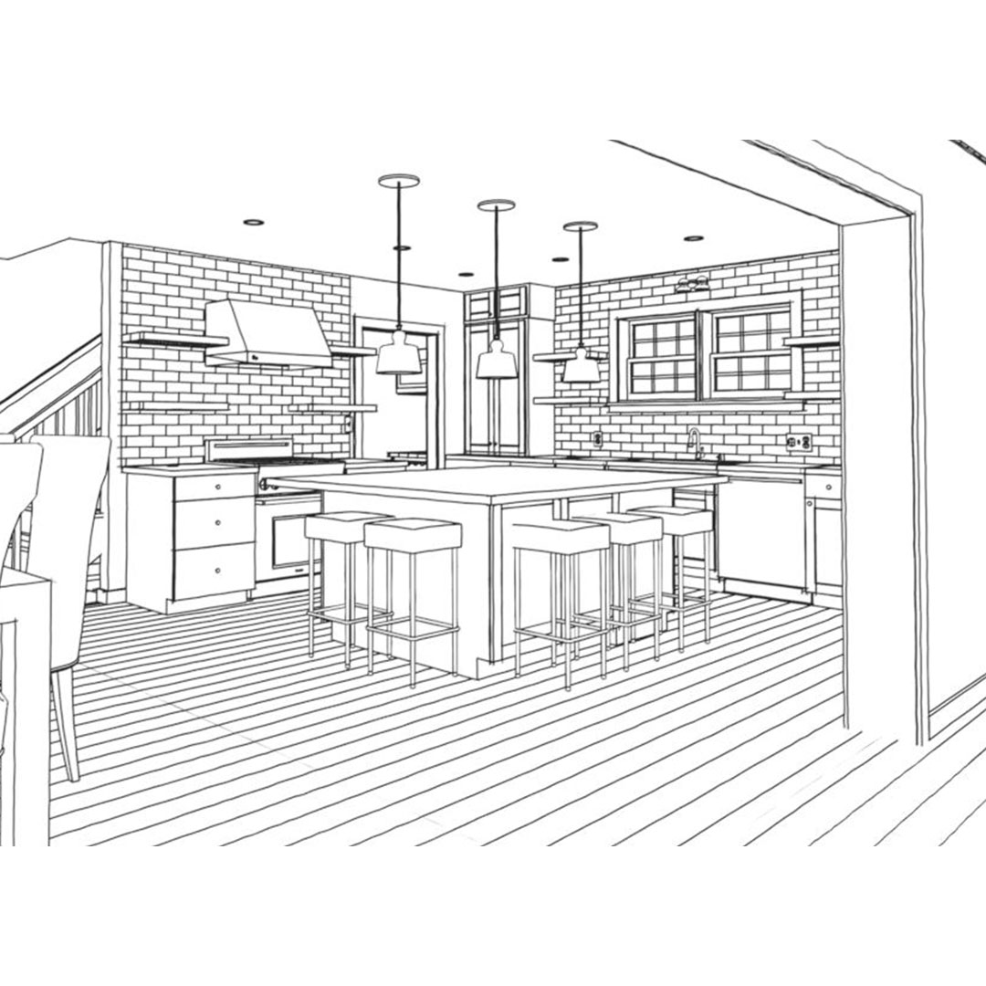 The design reconfigures space on both floors to create an open concept main floor and a grand main suite with an en suite bath and walk-in closet on the upper floor.