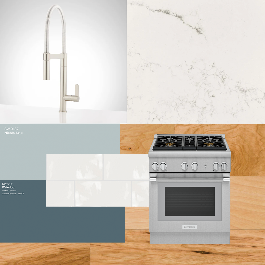 The kitchen design features blue cabinetry, Thermador appliances, and marble-look quartz countertops. We'll use a white subway tile with a textured surface for the backsplash. We'll install new hickory flooring throughout the first floor to create a cohesive open plan.