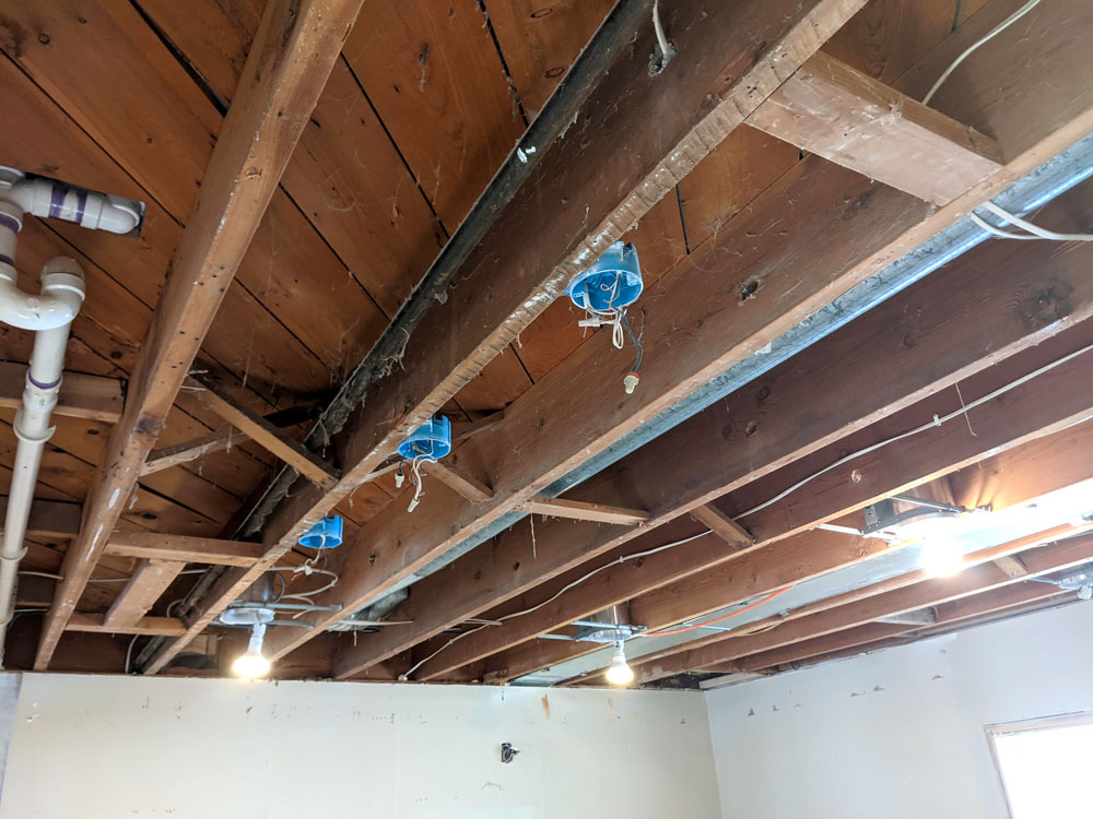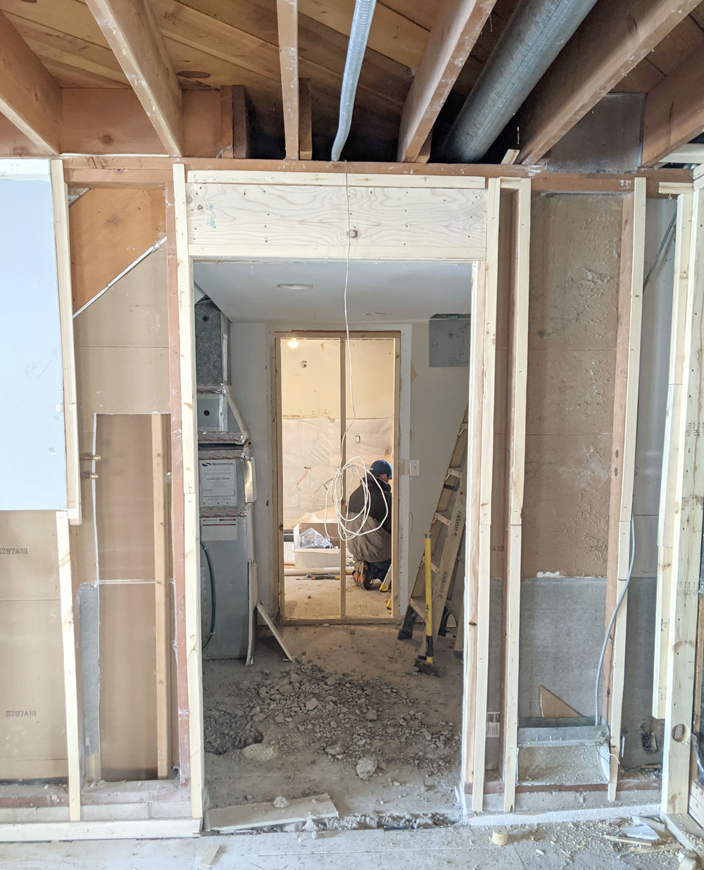 Originally, there was a small powder room upstairs off of the family room. We demoed that small bath and sealed up a stairway to make room for a large bath and walk-in closet. The new ensuite bath will need plumbing for the free-standing tub, shower, vanity, and toilet. We’ll also rough in the electrical outlets and make the planned connections for decorative and functional lighting.