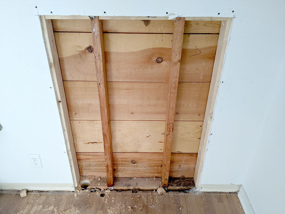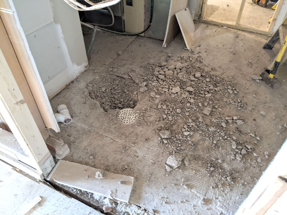 We demoed part of the pantry/utility area floor to add a new drain. We also removed part of the floor to run electrical to the new kitchen island.