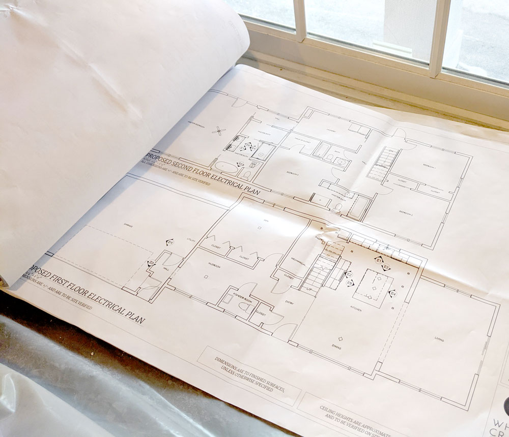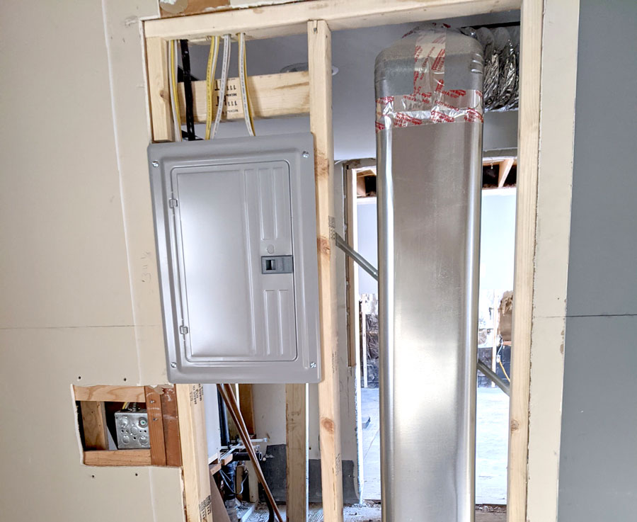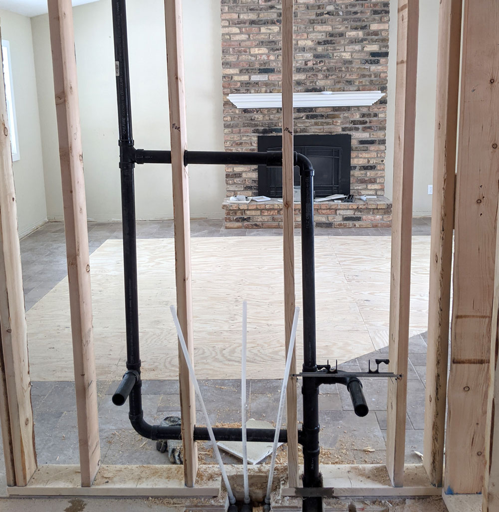 Roughing in the plumbing and electrical means creating paths in the framing for the electrical cables, water supply, and drain pipes to run through, making all of the connections in the plans. No fixtures (like faucets and decorative light fixtures) are installed during this stage. The electrical and plumbing plans are created during the design phase before construction begins. The rough-in scope for this project includes the den, kitchen, living room, laundry area, walk-in closet, and primary bedroom with en suite bath.