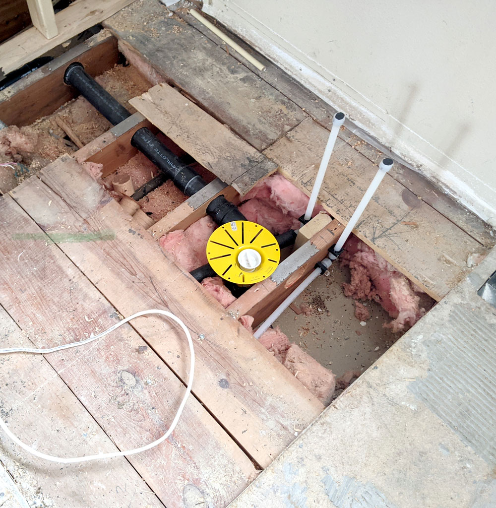 Plumbing is roughed in for the freestanding tub under the window in the new bathroom.