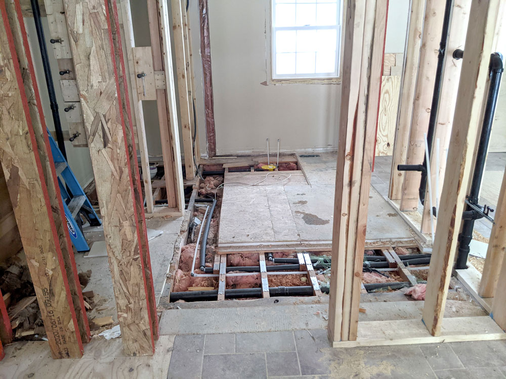 Roughing in the 2nd-floor en suite bath for the primary bedroom. Some new plumbing will be hidden in soffits at the back of the walk-in closet adjacent to the bathroom.