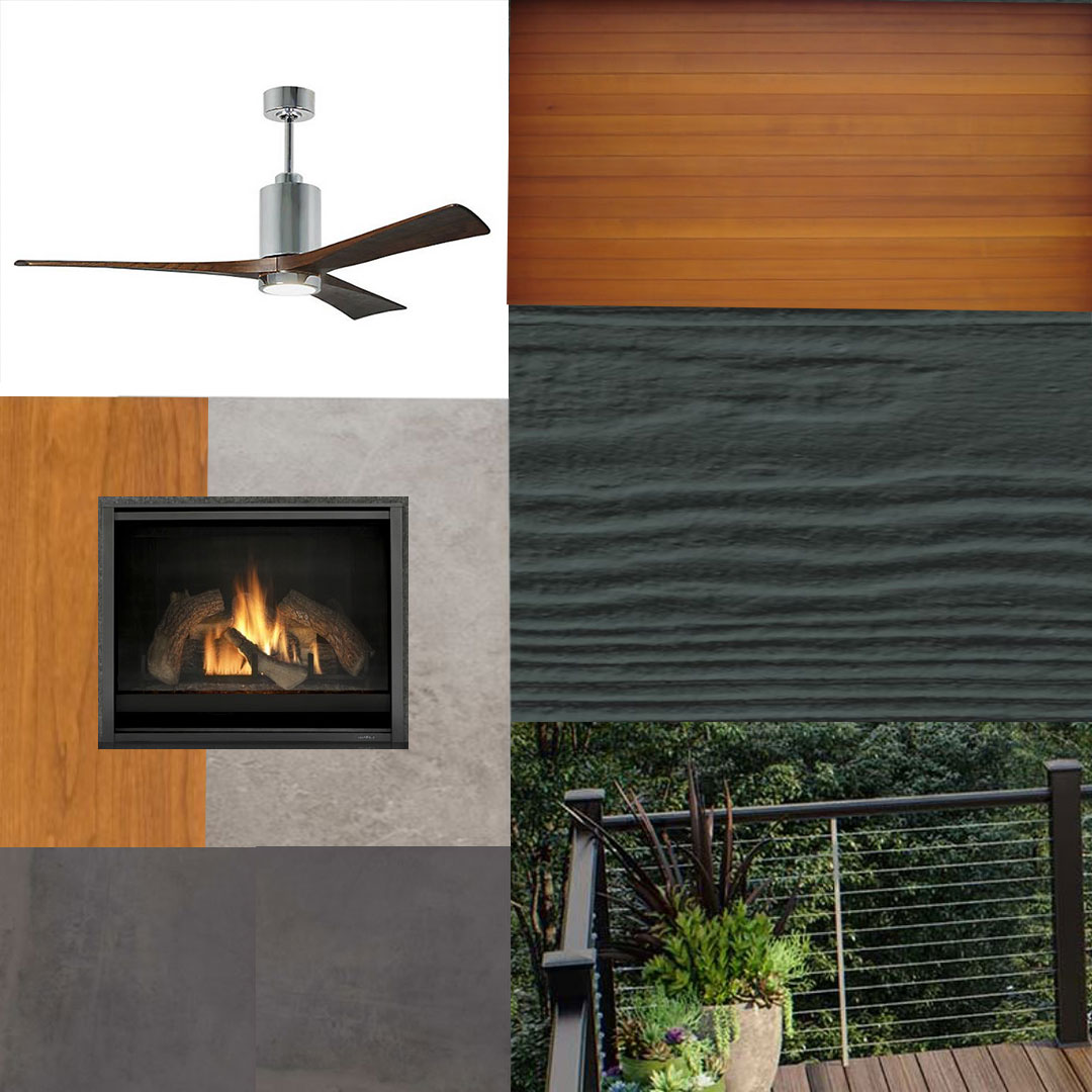 The Sunroom interior design will feature contemporary finishes and fixtures like a concrete-look tile fireplace surround, sheetrock returns (no trim) on the windows, and a modern ceiling fan.