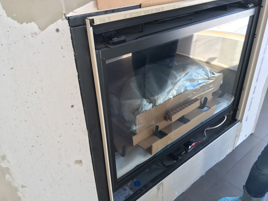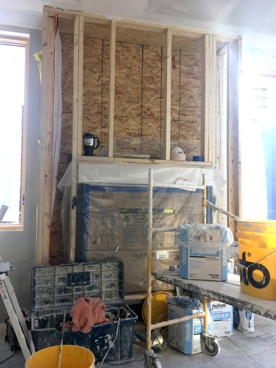 Sunroom | The drywall is complete, and the fireplace surround is ready for tile.