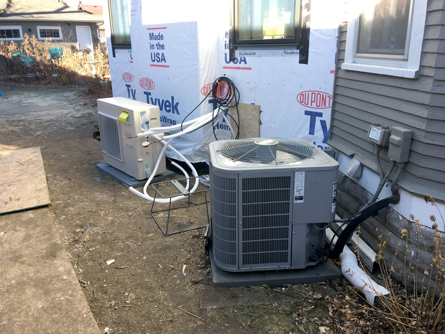 The exterior mini-split HVAC unit is installed near the main central air unit.