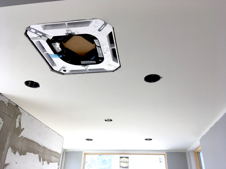 We’re installing mini-split HVAC ceiling cassettes in the Sunroom as well as the Master Bedroom on the Addition’s second floor. These units will help heat and cool the Addition. The minimal mini-split cassettes are quiet and integrate sleekly into the ceiling.