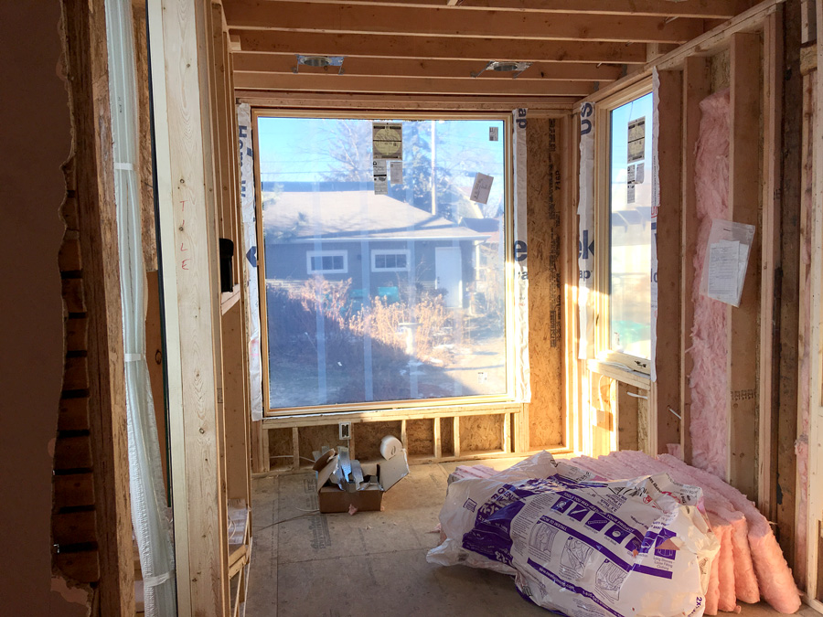 We are roughing-in electrical and running a gas line to fuel the fireplace. An unused gas line running to an original bedroom light fixture has been removed, as well as some old knob and tube wiring. The Sunroom rough-in includes electrical for the recessed lighting, a ceiling fan, and outlets.